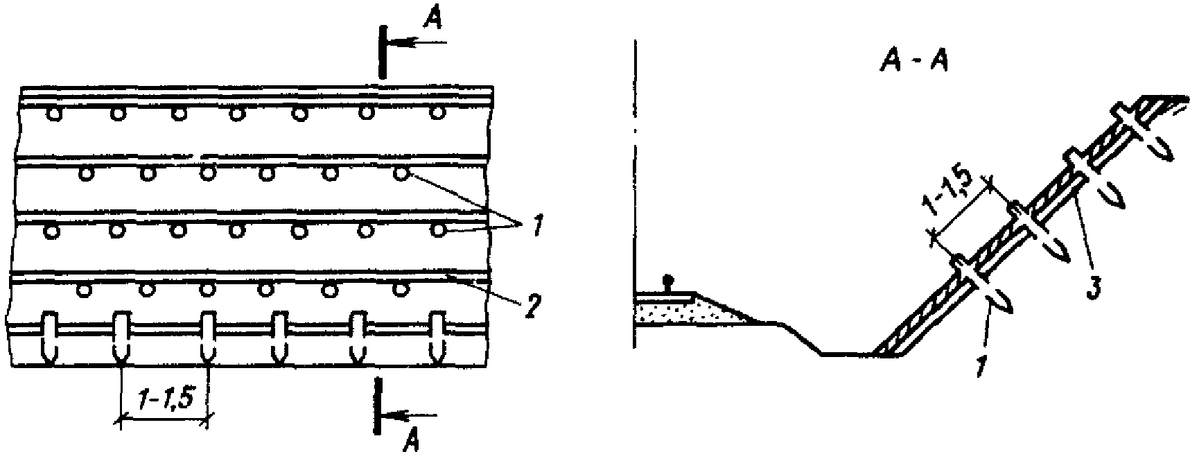 В случае влажных откосов скальных грунтов под слоем металлической сетки укладывают геотекстиль.