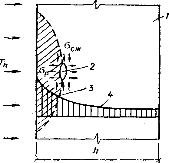 2 - трещина; 3 - траектория движения трещины; 4 - эпюра