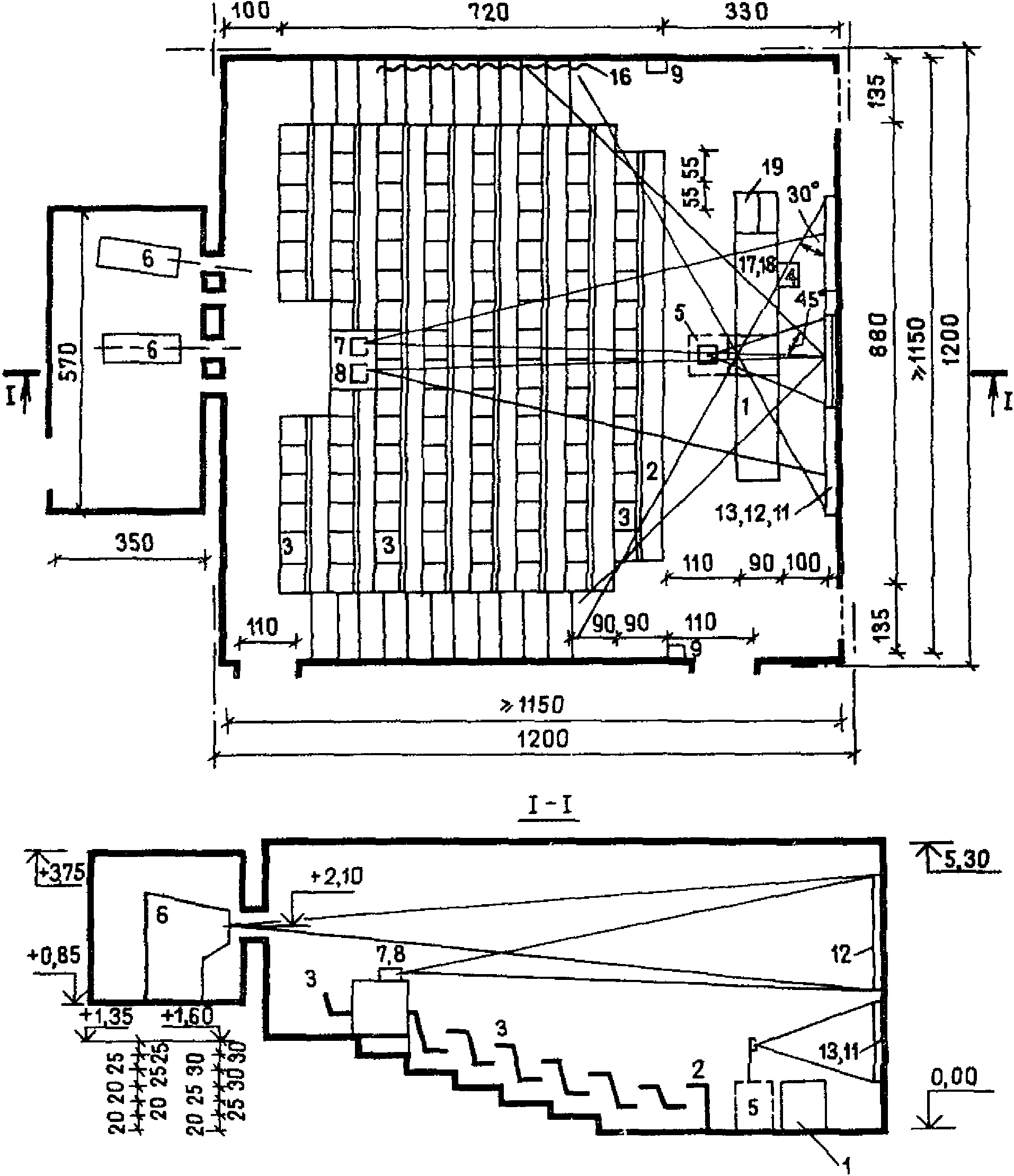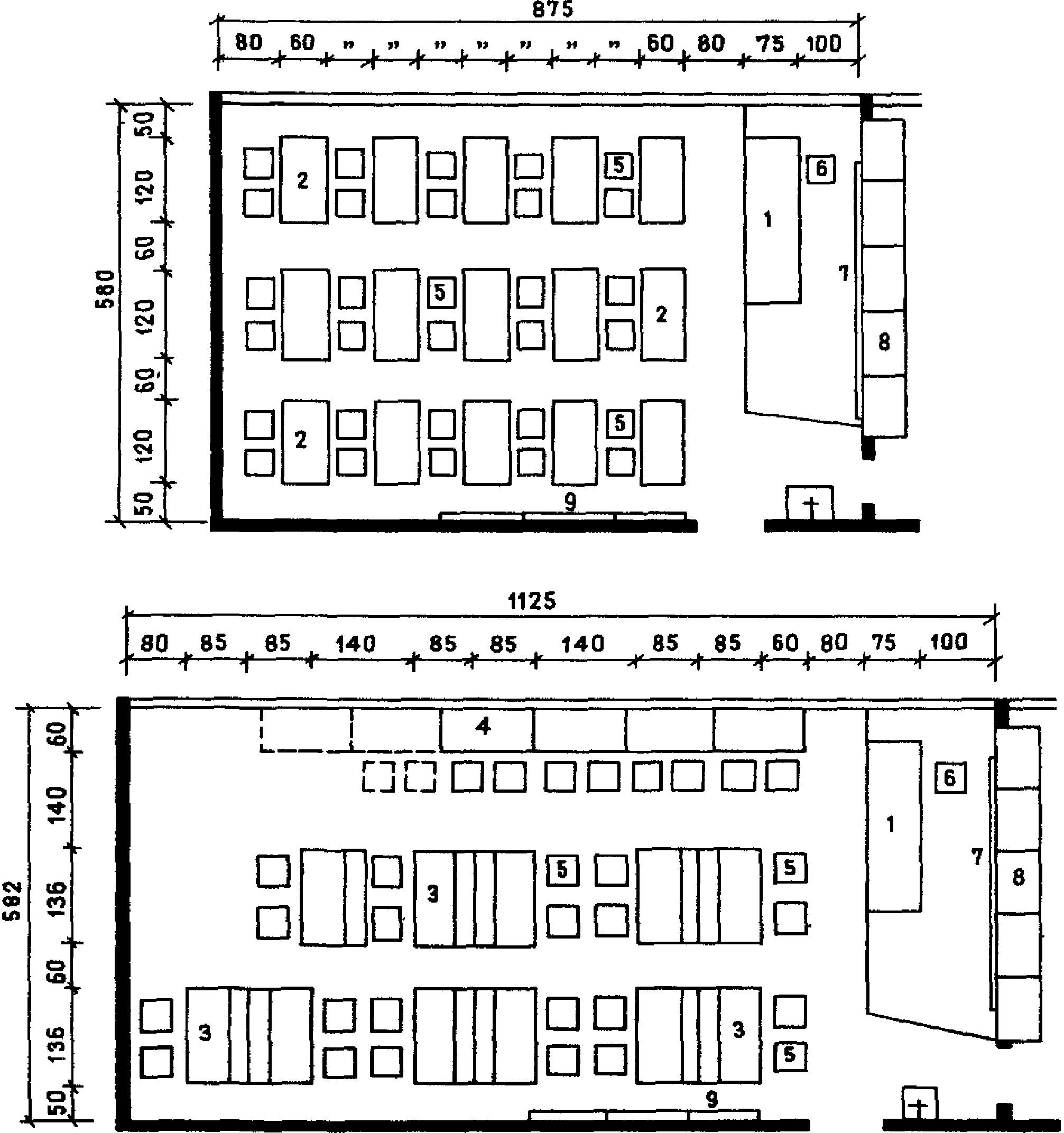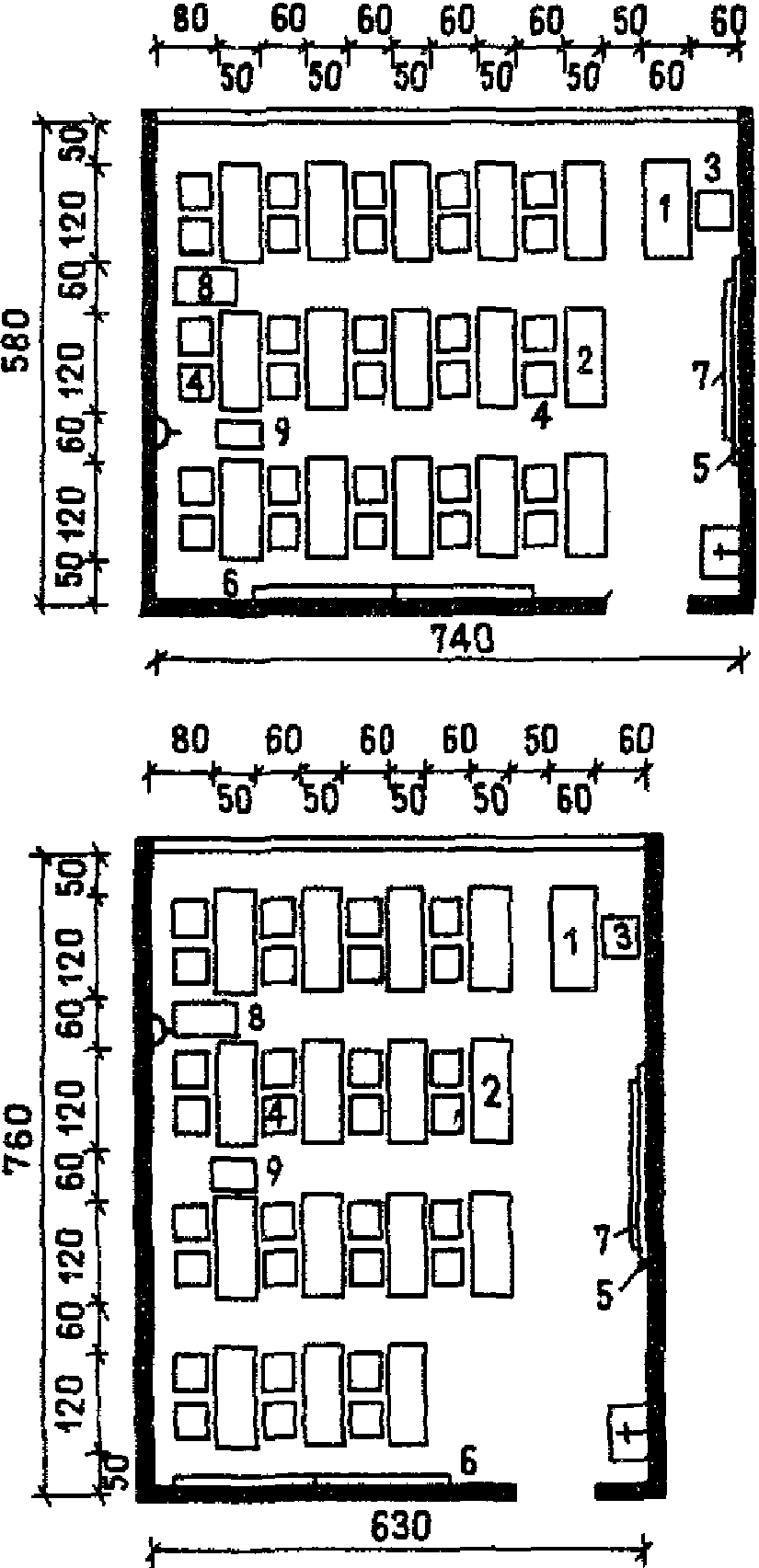 При проектировании профтехучилищ, подготавливающих кадры для строительства, транспорта, связи, сферы обслуживания населения, а также при проектировании средних специальных учебных заведений гуманитарного профиля (культуры, искусства, просвещения, здравоохранения и др.) целесообразно принимать типы зданий на 18, 24, 32 учебных групп, т.е. соответственно на 450, 600, 800 учащихся (наполняемость групп - 25 чел.) или 540, 720 и 900 учащихся (наполняемость групп - 30 чел.).