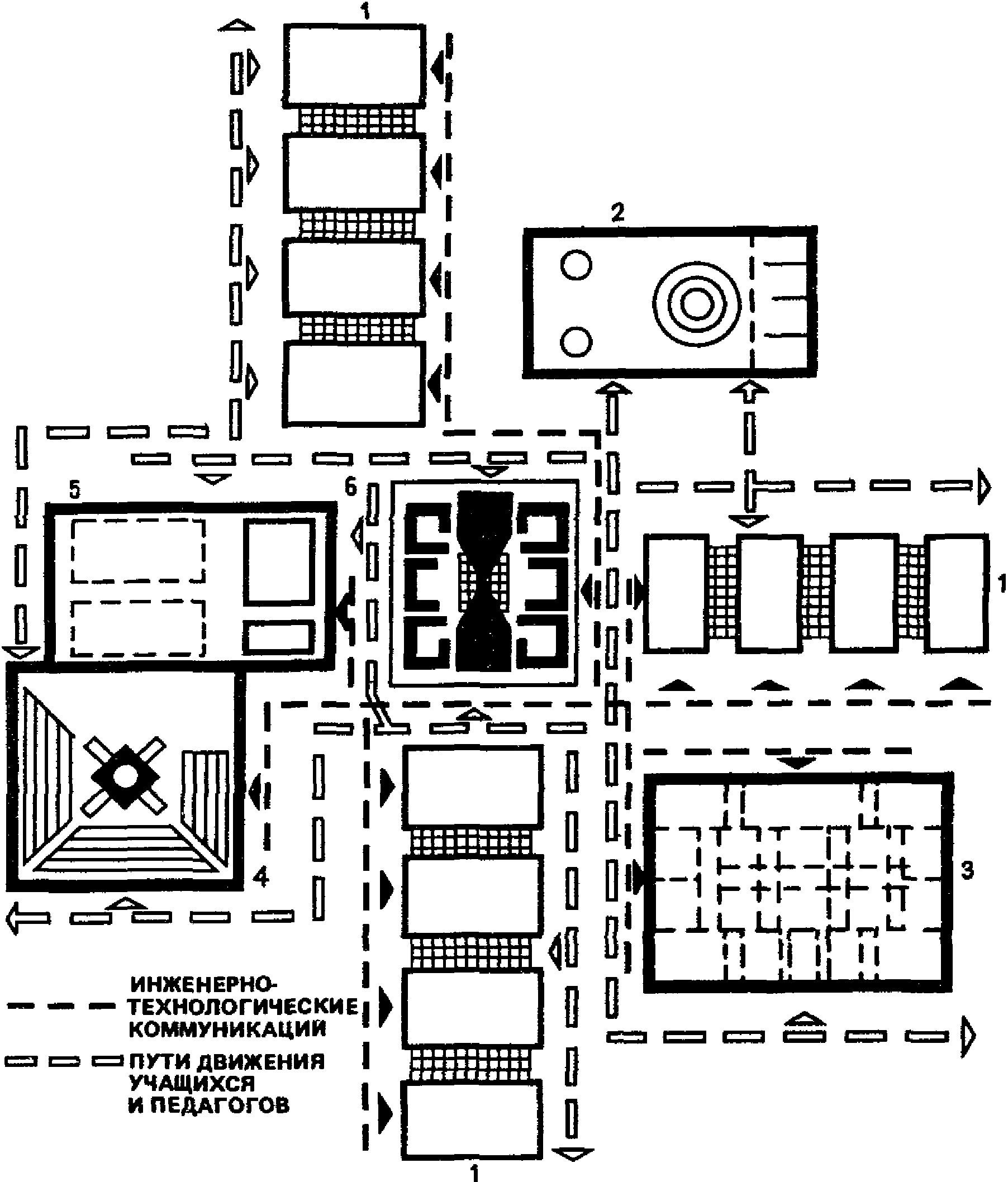 1.4. Строительство крупных по вместимости и кооперированных учебных заведений позволяет создать более полноценную, чем в мелких училищах и техникумах, учебно-материальную базу при экономном расходовании материальных ресурсов в расчете на одно учебное место. Это касается как единовременных затрат на строительство, так и последующей эксплуатации учебных зданий и помещений. За счет увеличения расчетной вместимости учебных заведений и их объединения улучшаются не только технико-экономические и функциональные показатели, но и архитектурно-градостроительные качества зданий, укрупняется масштаб застройки, обеспечивается целостность архитектурного решения разрозненных объектов образования молодежи и достигается эффективность использования земельных, в том числе городских территорий с ограниченными строительными участками.