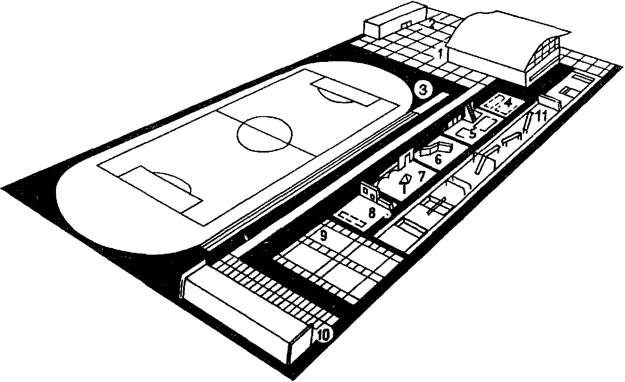 2.9. Размеры функциональных зон участка - учебной, производственной и спортивной - показаны в табл. 3. Рекомендуемый состав спортивной зоны участка рассматривается в