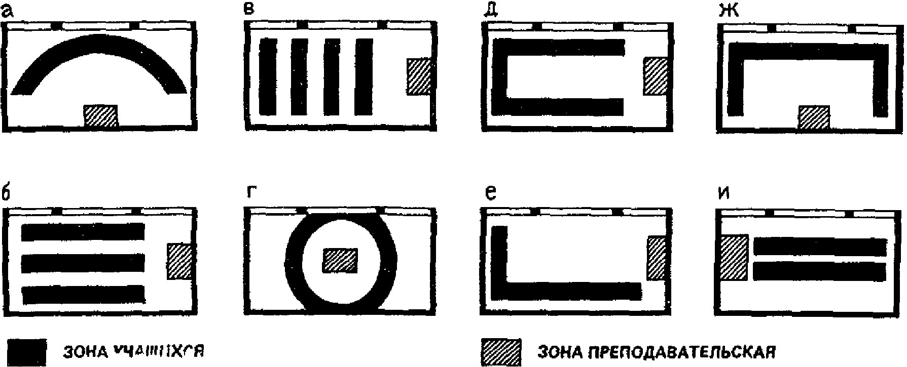 рисунка, рабочая зона формируется либо в центральной части помещения, либо равномерно по помещению, либо вдоль стен. Независимо от способа формирования общим требованием остается зашторивание светопроемов.