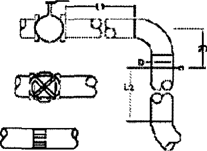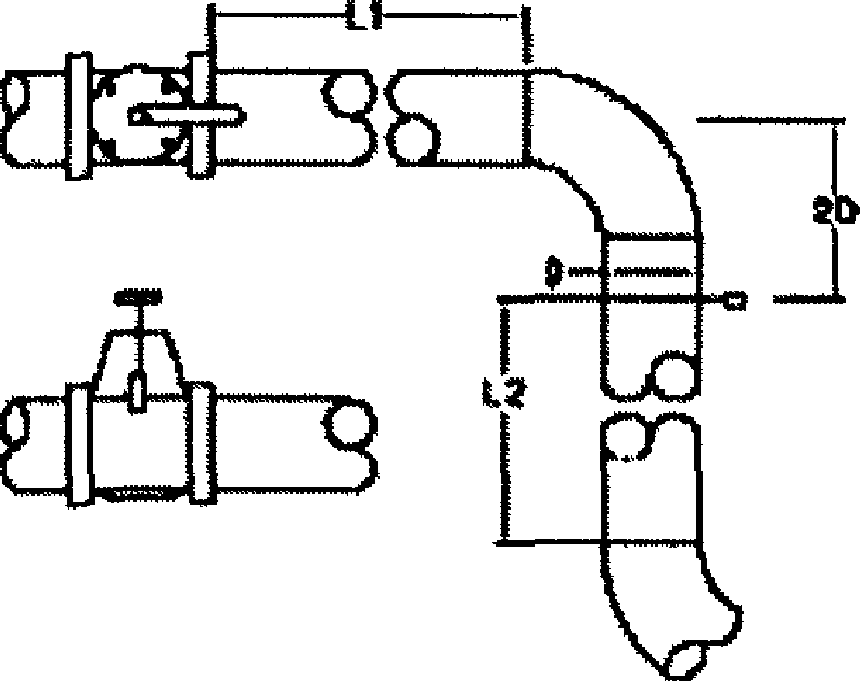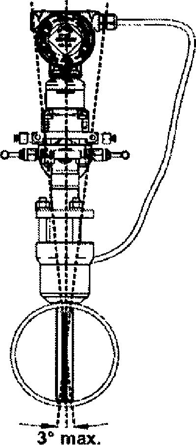 Примечания 1. Трубку ANNUBAR располагают в плоскости изгиба с наклоном в любую сторону не более 3°. 2. Прямолинейные участки приведены для полностью открытых кранов. Для кранов в промежуточном положении и для регулирующих клапанов L1 = 16D. |