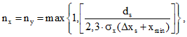б) количество "виртуальных" источников по направлениям осей x и y совпадает nx = ny и определяется из условия, обеспечивающего на расстоянии более xmin от источника гладкий (одномодальный) профиль концентрации