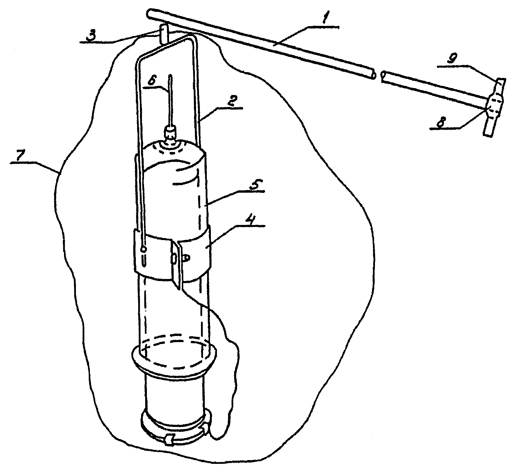 рис. 4.1. Устройство состоит из сборного шеста 1 длиной около 5 м, направляющей рамки 2, крепежной трубки 3, крепления для шприца 4 и шприца 5 емкостью 100 мл. Шприц снабжают иглой 6 малого диаметра с тем расчетом, чтобы поршень шприца, опускаясь под действием собственной силы тяжести, наполнял цилиндр отбираемым воздухом в течение 5 - 10 минут. Отбор проб воздуха производится в цельностеклянные шприцы емкостью 100 мл и осуществляется в соответствии с