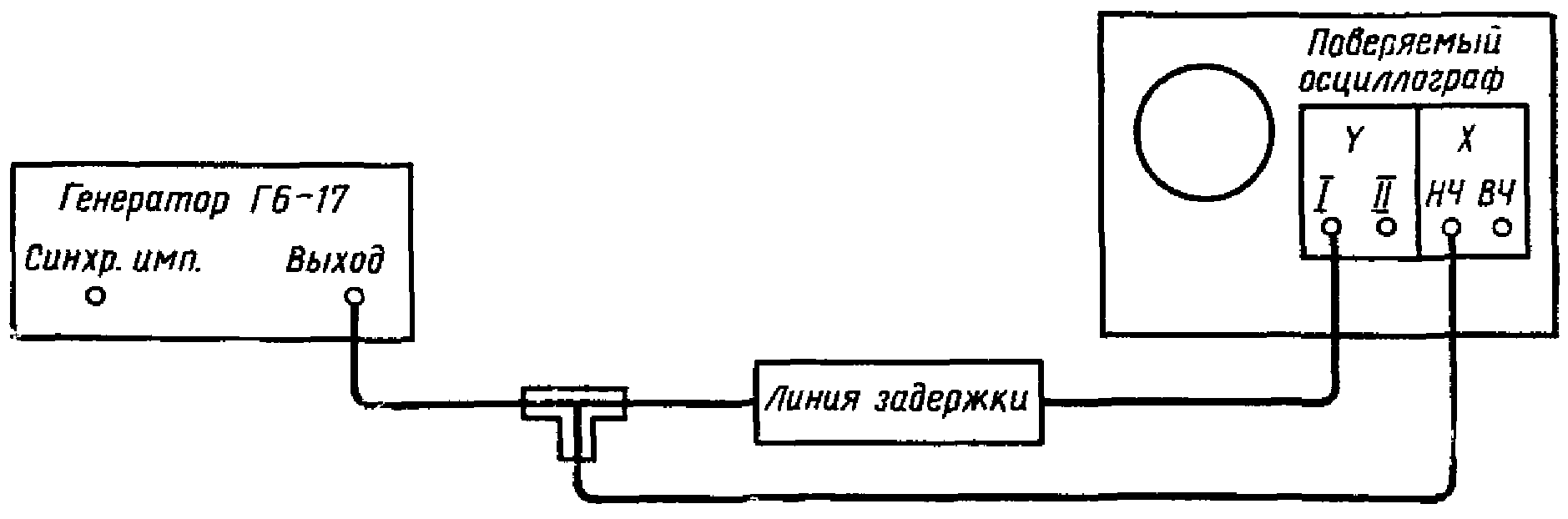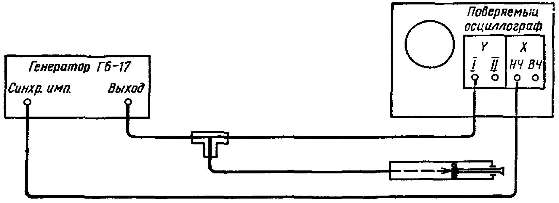 Выход I генератора Г6-17 подключить через аттенюатор, входящий в комплект поверяемого осциллографа, к тройнику. Ослабление аттенюатора выбрать таким, чтобы напряжение сигнала на входе осциллографа не превышало предельно допустимого для поверяемого типа прибора. Один выход тройника соединить со входом Y тракта одного из каналов осциллографа, второй - с короткозамкнутой подвижной нагрузкой измерительной линии Р1-22. Запустить осциллограф импульсом синхронизации генератора Г6-17, регулировкой задержки вывести изображение отраженного от короткозамкнутой линии сигнала в конец рабочей части ЭЛТ по оси X при максимальной длине короткозамыкателя. Совместить фронт перепада напряжения с последней риской шкалы. Плавно перемещая короткозамыкатель линии, переместить фронт на три деления влево и отсчитать длину перемещения поршня. Действительное значение временного интервала длительности развертки, соответствующего трем делениям шкалы X осциллографа (в нс), определить по формуле