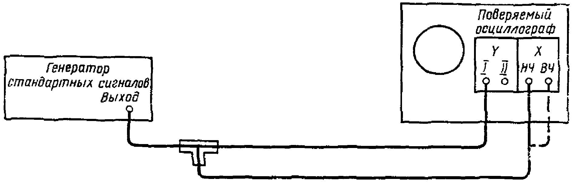 рис. 8. В качестве источников калиброванных сигналов используют генераторы Г4-102, Г4-116, Г4-128, Г4-94, Г4-95, Г4-96. Выход генератора через аттенюатор, входящий в комплект поверяемого осциллографа, соединить с тройником. Ослабление аттенюатора выбрать таким, чтобы напряжение сигнала на входе осциллографа не превышало предельно допустимого для поверяемого типа прибора. Один выход тройника соединить со входом Y тракта одного из каналов осциллографа, другой со входом НЧ или ВЧ (в зависимости от частоты синусоидального сигнала) синхронизации. Переключатель коэффициента отклонения поставить в положение максимального коэффициента отклонения. Ручку плавной регулировки коэффициента развертки поставить в положение "калибровано". Установить частоту генератора такой, чтобы на рабочей части ЭЛТ по оси X наблюдалось количество периодов синусоиды, равное числу больших делений шкалы X. Ручкой регулировки выхода генератора установить размах изображения, составляющий не менее 80% рабочей части ЭЛТ по оси Y. Ручками подстройки синхронизации осциллографа получить на экране устойчивое изображение и смещением по вертикали установить его в центре рабочей части. Плавно меняя частоту генератора и задержку осциллографа, совместить начало первого и конец третьего периода синусоидального сигнала с рисками шкалы X ЭЛТ так, чтобы эти три периода занимали три больших деления шкалы X ЭЛТ в начале ее рабочей части. Произвести отсчет установленной частоты по шкале генератора. Аналогичным образом совместить три периода синусоидального сигнала с рисками трех больших делений в центре рабочей части шкалы X, а затем на конце шкалы и произвести отсчеты частоты по шкале генератора. Определить погрешность калиброванного коэффициента развертки для каждого измерения по формуле