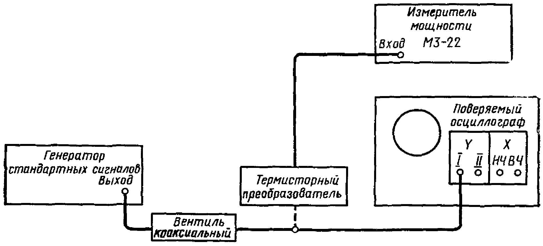 п частотах термисторного преобразователя. На каждой частоте измерения производится установка уровня мощности с генератора сигналов с помощью измерителя мощности М3-22, после чего сигнал подается на вход поверяемого осциллографа. Осциллограф включить в автоколебательный режим, установить коэффициент отклонения 200 мВ/дел.; через коаксиальный вентиль подключить вход одного из каналов вертикального отклонения, замерить размах изображения сигнала по вертикали на экране ЭЛТ на измеряемой частоте. Измерения провести для каждого канала вертикального отклонения поверяемого осциллографа. Полосу пропускания определить как диапазон частот, в котором размер изображения сигнала по вертикали имеет снижение до 0,7 от размера, соответствующего опорной частоте, равной