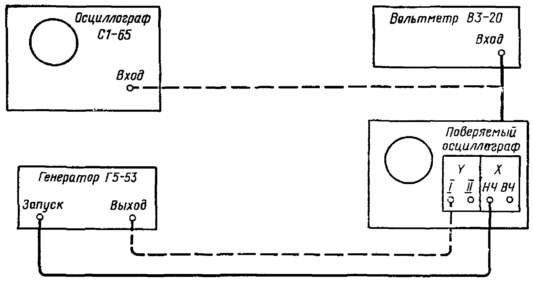 рис. 2. Поверяемый осциллограф включить в режим внешнего запуска, синхронизацию производить от генератора импульсов Г5-53, частоту запуска установить равной 10 кГц. К выходу аналогового сигнала подключить вольтметр В3-20, установить минимальный коэффициент отклонения и замерить уровень шумов одного из каналов. Подключить основной выход импульсов генератора Г5-53 ко входу поверяемого канала прибора, установить длительность импульса 1 мкс, амплитуду 200 мВ. К выходу аналогового сигнала поверяемого прибора подключить осциллограф С1-65 и замерить по нему амплитуду импульса на выходе аналогового сигнала. Определить коэффициент передачи K
