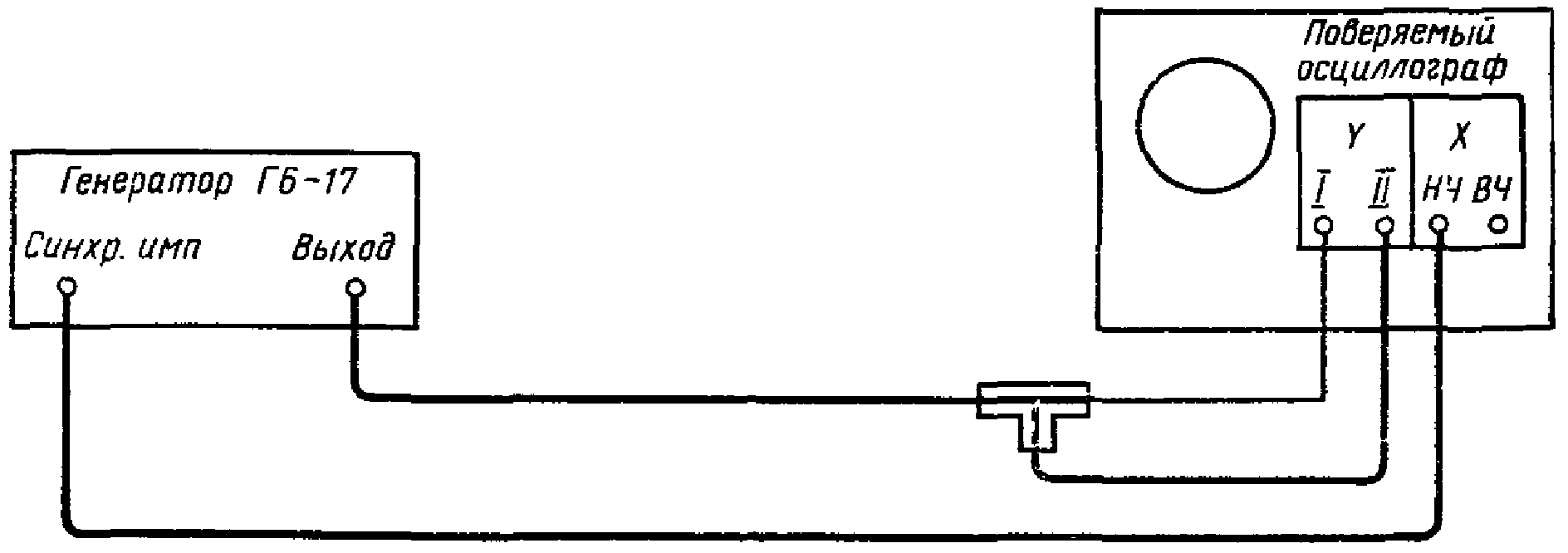 Выход генератора Г6-17 подключить к тройнику, один выход тройника соединить непосредственно со входом 1-го канала поверяемого осциллографа, ко второму выходу разветвителя подключить кабель длиной 0,3 - 0,5 м. Выход импульса синхронизации генератора подключить ко входу внешнего запуска осциллографа, переключатель рода работ поставить в положение двухканальной работы. Переключатель коэффициента отклонения поставить в положение 200 мВ/дел., коэффициент развертки установить 0,5 - 1 нс/дел.
