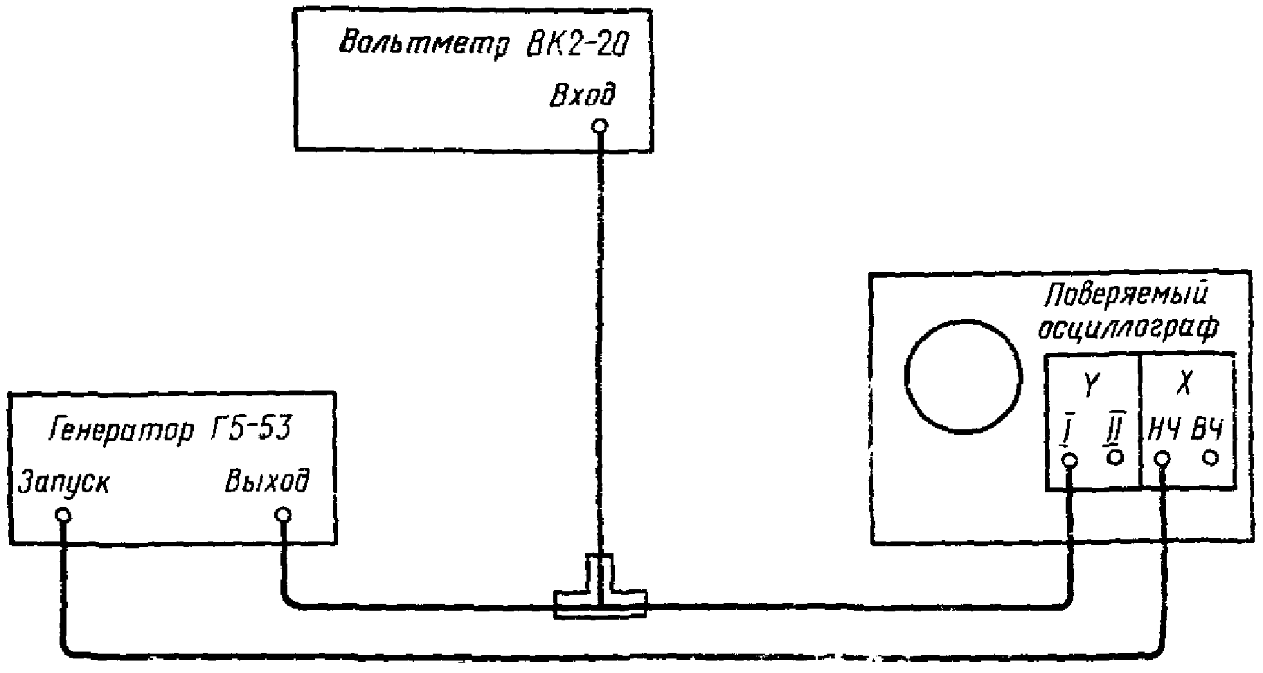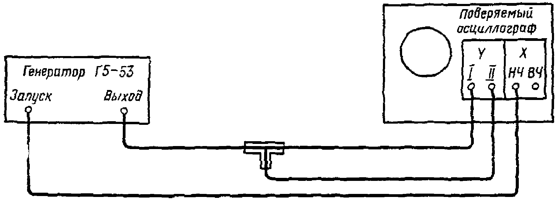 рис. 1. На оба канала вертикального отклонения одновременно подать через тройник, входящий в комплект поверяемого осциллографа, основной импульс с генератора Г5-53, выход синхронизации генератора соединить со входом низкочастотной (НЧ) синхронизации осциллографа. Установить амплитуду основного и запускающего импульса генератора в соответствии с допустимыми значениями для поверяемого типа осциллографа. Перевести осциллограф в режим внешнего запуска и с помощью органов регулировки чувствительности и подстройки синхронизации осциллографа получить устойчивое изображение импульса генератора на экране ЭЛТ. Проверить возможность правильной установки коэффициента передачи по петле обратной связи обоих каналов вертикального отклонения органами подстройки. Проверить основные режимы и рабочие функции осциллографа, приведенные в инструкции по эксплуатации на поверяемый прибор.