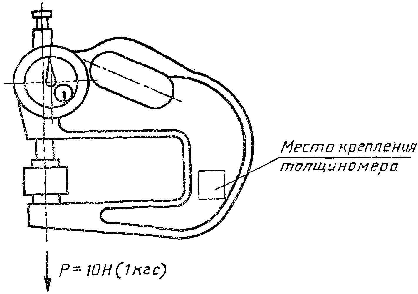 4.3.5. Жесткость корпуса толщиномеров типа ТР проверяют гирей 0,5 кг. Измерительный стержень толщиномера устанавливают в среднее положение по концевой мере, к пятке толщиномеров подвешивают груз. Место закрепления толщиномера и место подвешивания груза даны в