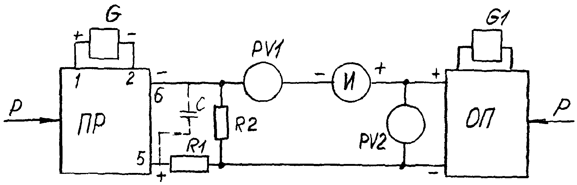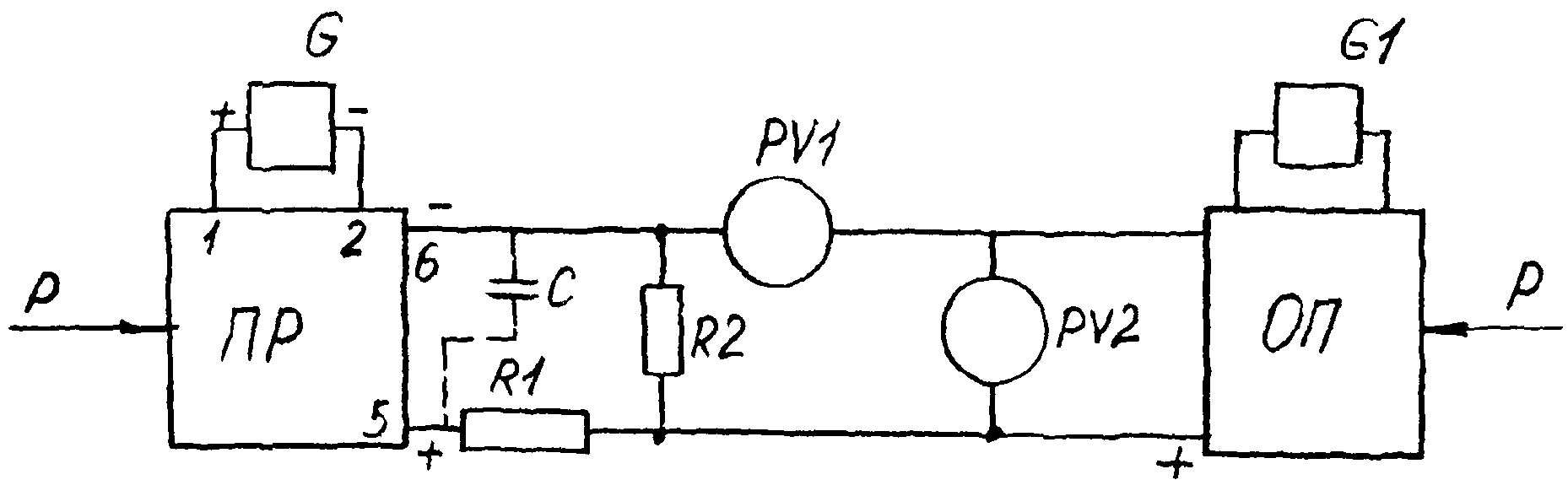 для измерения разности выходных сигналов и для измерения выходного сигнала ОП (контроля давления или разряжения), например, вольтметр Щ 1516. Погрешность измерения давления или разряжения должна быть не ниже 1% верхнего предела измерений или суммы верхних пределов измерений. Допускается вместо RV1 и RV2 использовать один вольтметр с переключением его для соответствующих измерений, при этом на месте второго вольтметра должен быть предусмотрен разрыв цепи.