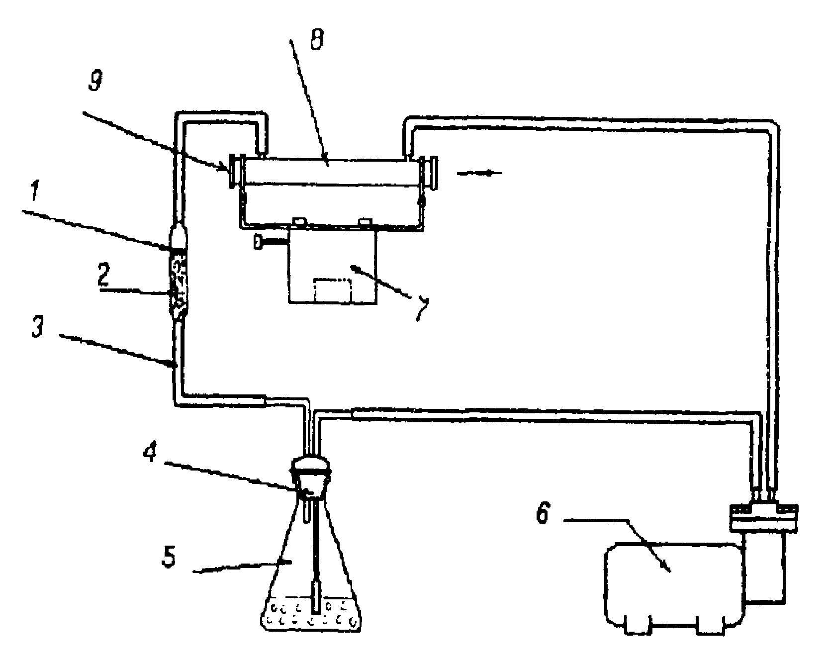6.1.3. Отбор проб из газового потока проводят с помощью пробоотборного устройства, схема которого показана на рисунке 1а. Пробу из потока дымовых газов отбирают через штуцер, устанавливаемый в стенке газохода 1 с уплотнительной насадкой 2. Пробоотбор производят при помощи пробоотборного зонда 4 (фторопластовой трубки с внутренним диаметром 0,008 м), имеющего наконечник, повернутый навстречу потоку дымовых газов.