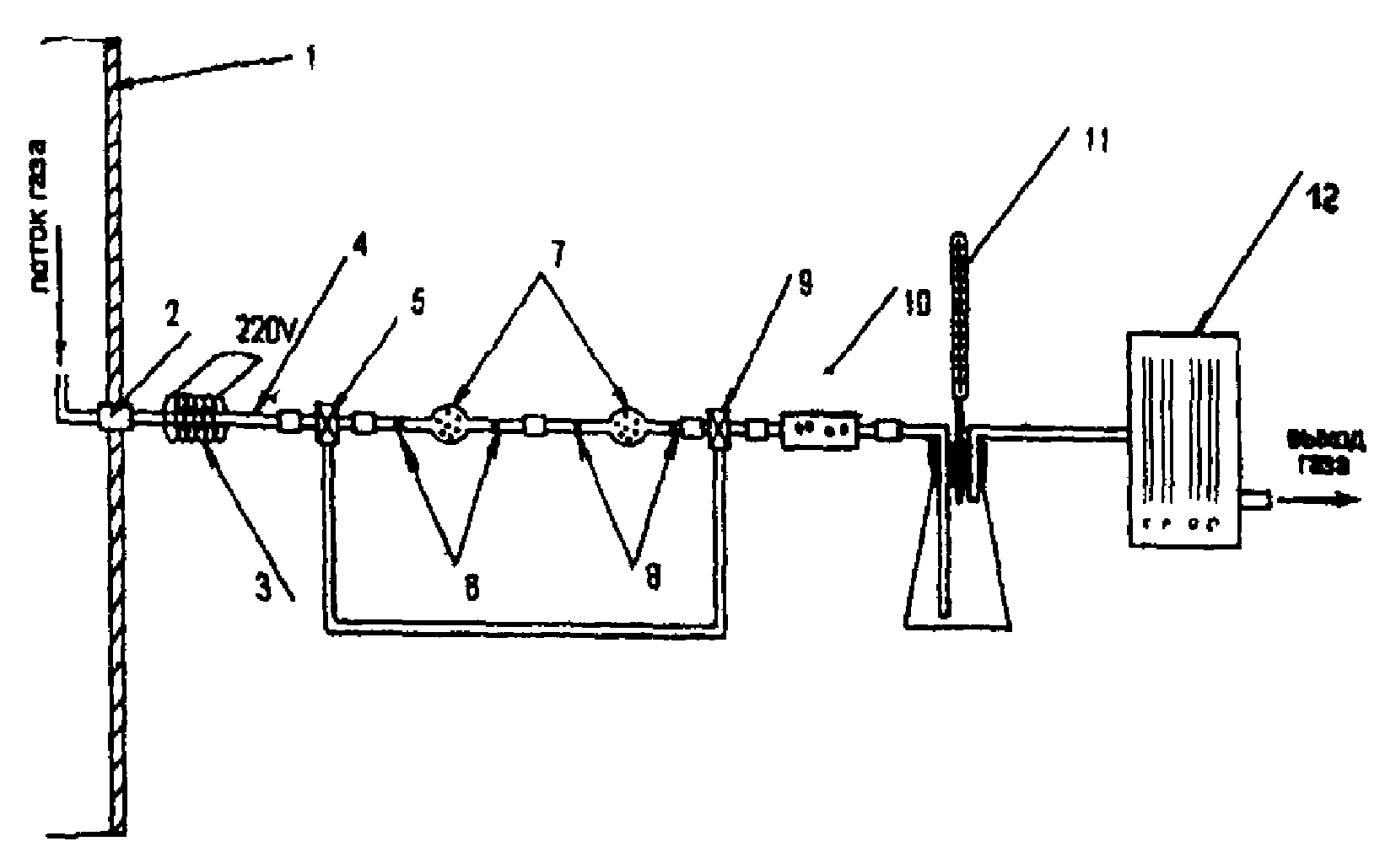 1 - газоход котла; 2 - насадка уплотнительная; 3 - электронагреватель 220 В; 4 - пробоотборный зонд; 5, 9 - трехходовые краны; 6, 8 - вата; 7 - поглотительные трубки; 10 - осушитель; 11 - термометр; 12 - аспиратор