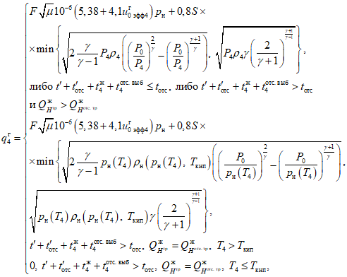 для расчета скоростей истечения со звуковой скоростью решается S-P задача определения состояния, включая скорость звука, при заданном значении давления и энтропии, при этом энтропия полагается равной энтропии в исходном состоянии, а давление - равным атмосферному, исходный состав полагается равным составу в неразрушенном оборудовании;