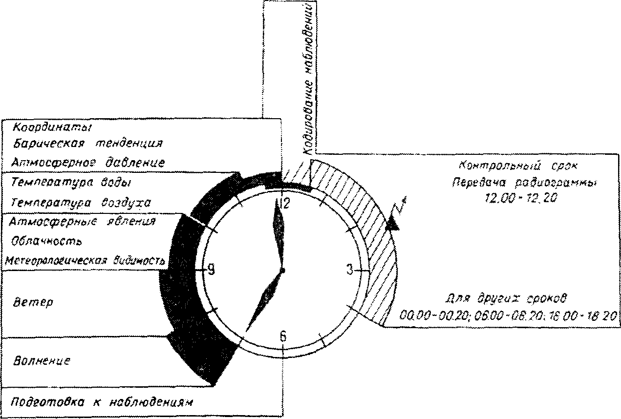 рис. 1.1). За 20 мин до "срочного" часа штурман начинает визуальные наблюдения над облачностью, видимостью, волнением и морскими льдами. После этого по анемометру определяет скорость ветра и с помощью компаса (репитера) определяет направление ветра и волнения. Одновременно определяется курс судна, пеленг на кромку льда и ее направление.