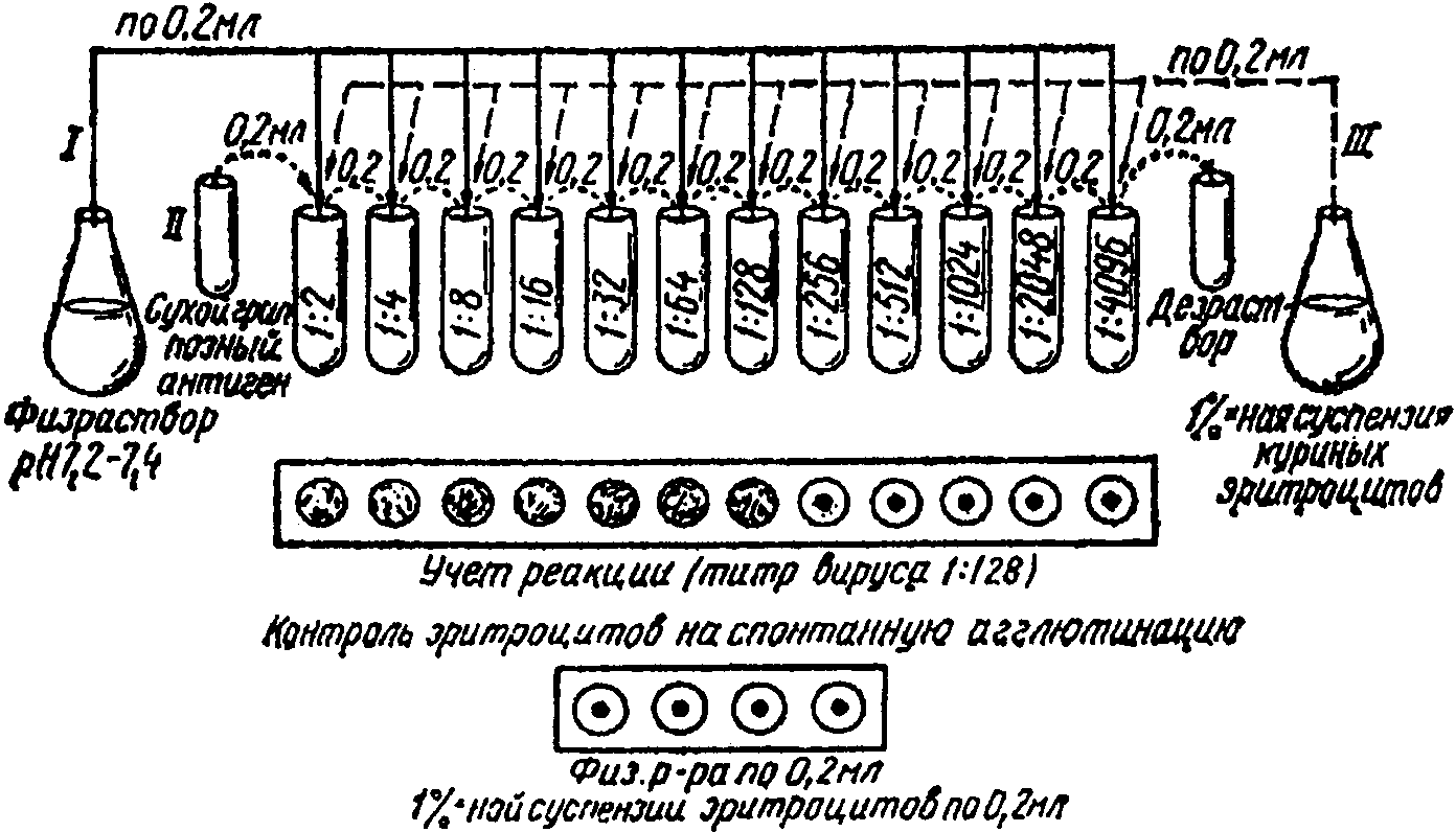 1) контроль сыворотки для исключения присутствия гемагглютининов к куриным эритроцитам (0,2 мл сыворотки в разведении 1:10, 0,2 мл физиологического раствора и 0,4 мл 1%-ной суспензии эритроцитов);