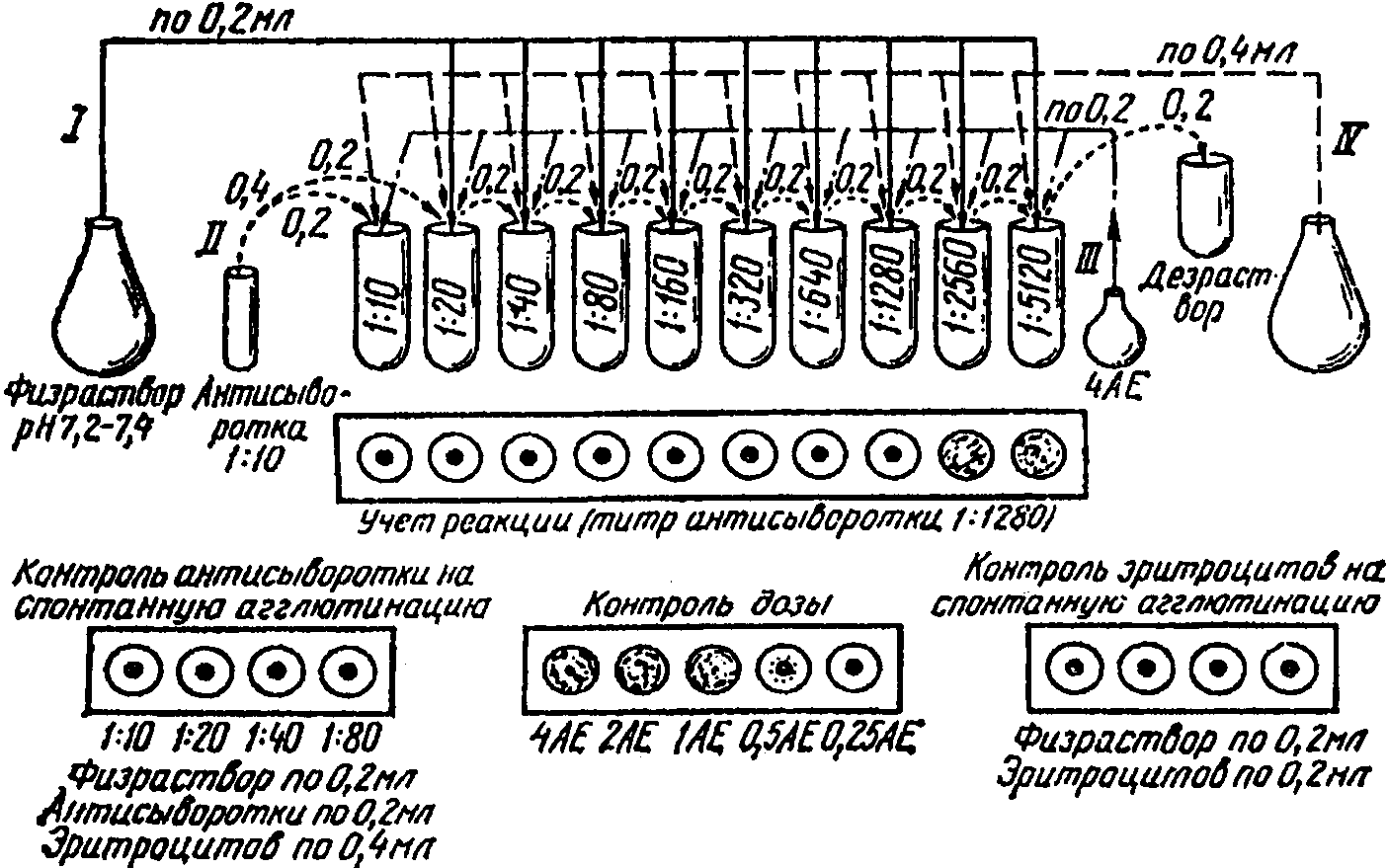 (рис. 10) берут 5 лунок, в первую и вторую наливают 4 АЕ по 0,2 мл, т.е. выбранное разведение вируса, после чего во вторую, третью, четвертую, пятую лунки наливают по 0,2 мл физиологического раствора. После пипетирования из второй лунки переносят 0,2 мл в третью, из третьей после смешивания 0,2 мл переносят в четвертую, а затем в пятую, из пятой лунки удаляют 0,2 мл смеси в дезинфицирующий раствор. Таким образом, во 2-й лунке остается 2 АЕ вируса, в 3-й - 1 АЕ, в 4-й - 0,5 АЕ, в 5-й - 0,25 АЕ. После этого в каждую лунку добавляют по 0,2 мл 1%-ной суспензии эритроцитов, доски легко встряхивают и оставляют на 30 мин при комнатной температуре. При правильном выборе рабочей дозы (4 АЕ) в 1-й, 2-й, 3-й лунках должна быть полная агглютинация эритроцитов (зонтик); в 4-й лунке агглютинация может быть частичной или отсутствовать, а в 5-й лунке агглютинация не должна быть. Если в 4-й лунке оказывается полная агглютинация, а в 5-й частичная или отсутствует - это означает, что выбранная доза вируса содержит не 4 АЕ, а больше (8 АЕ). В этом случае и доза должна быть соответственно уменьшена вдвое, т.е. следует взять 0,2 мл следующего разведения и повторно проверить рабочую дозу. Особенно важно, чтобы в 3-й лунке, где должна быть 1 АЕ вируса, была бы полная агглютинация. Если в ней агглютинация не полная, то выбранная рабочая доза вируса содержит меньше 4 АЕ в 0,2 мл и должна быть увеличена и повторно проверена.