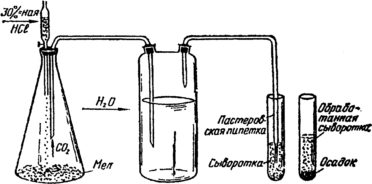 14. Для осаждения термостабильных ингибиторов через разведенную и прогретую сыворотку пропускают углекислый газ (CO2) из аппарата Киппа (схема 4) в течение 2...3 мин или опускают в нее кусочки твердой углекислоты. После обработки углекислотой сыворотку центрифугируют в течение 5 мин при 2 тыс. об/мин. После чего сыворотку используют в реакции торможения гемагглютинации для идентификации вируса.