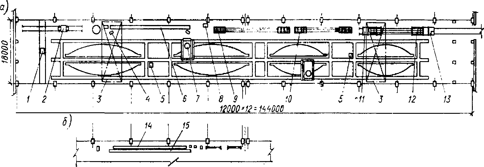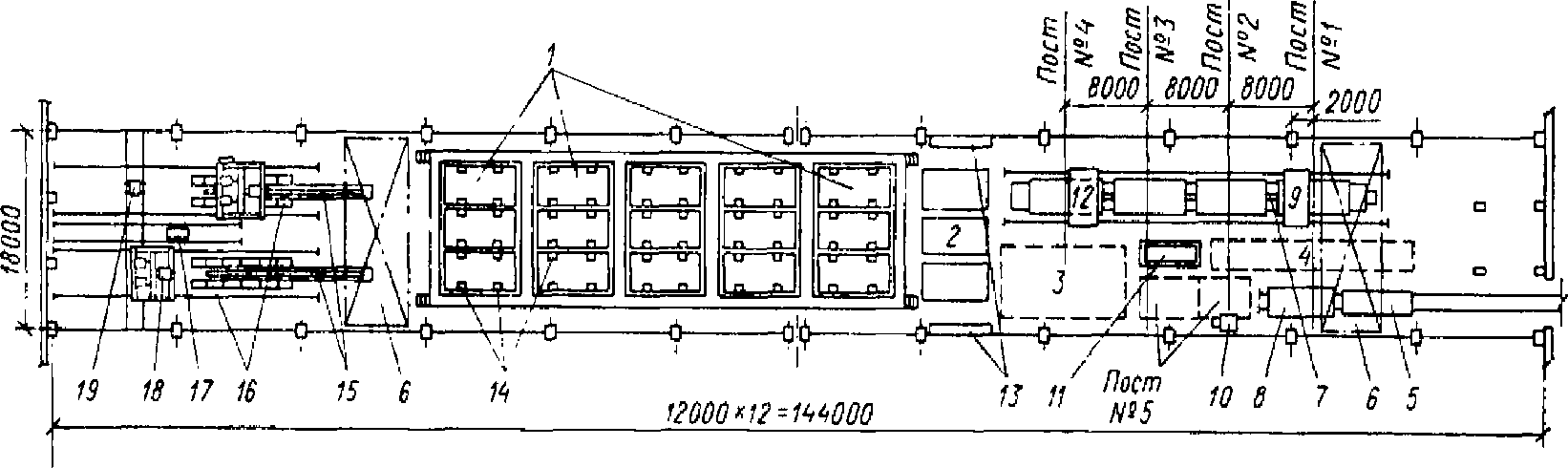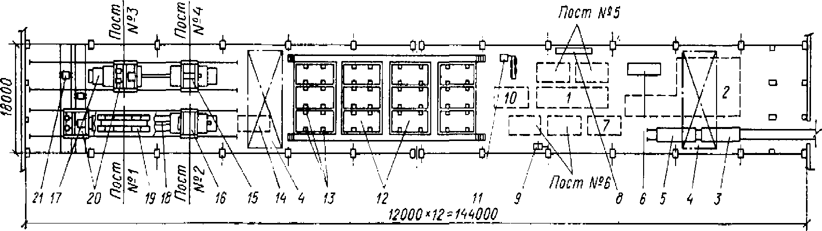 В каждой стенд-камере размещена одна форма. Примерная годовая производительность пролета 7 тыс. м3. При заготовке прядевой арматуры на линии СМЖ-213 пряди режутся на плети мерной длины, которые затем собираются в пакеты. Концы прядей пропускаются через анкерные плиты, и на них надеваются цанговые зажимы НИИЖБ.
