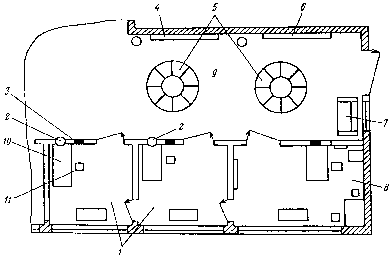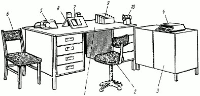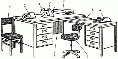 3 - тумбочка; 4 - настольная счетно-клавишная машина;