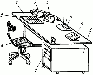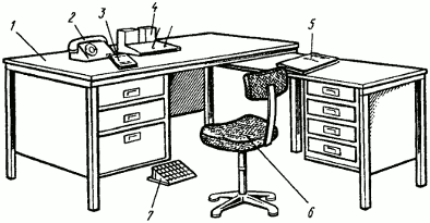 1 - рабочий стол; 2 - стул рабочий подъемно-поворотный;