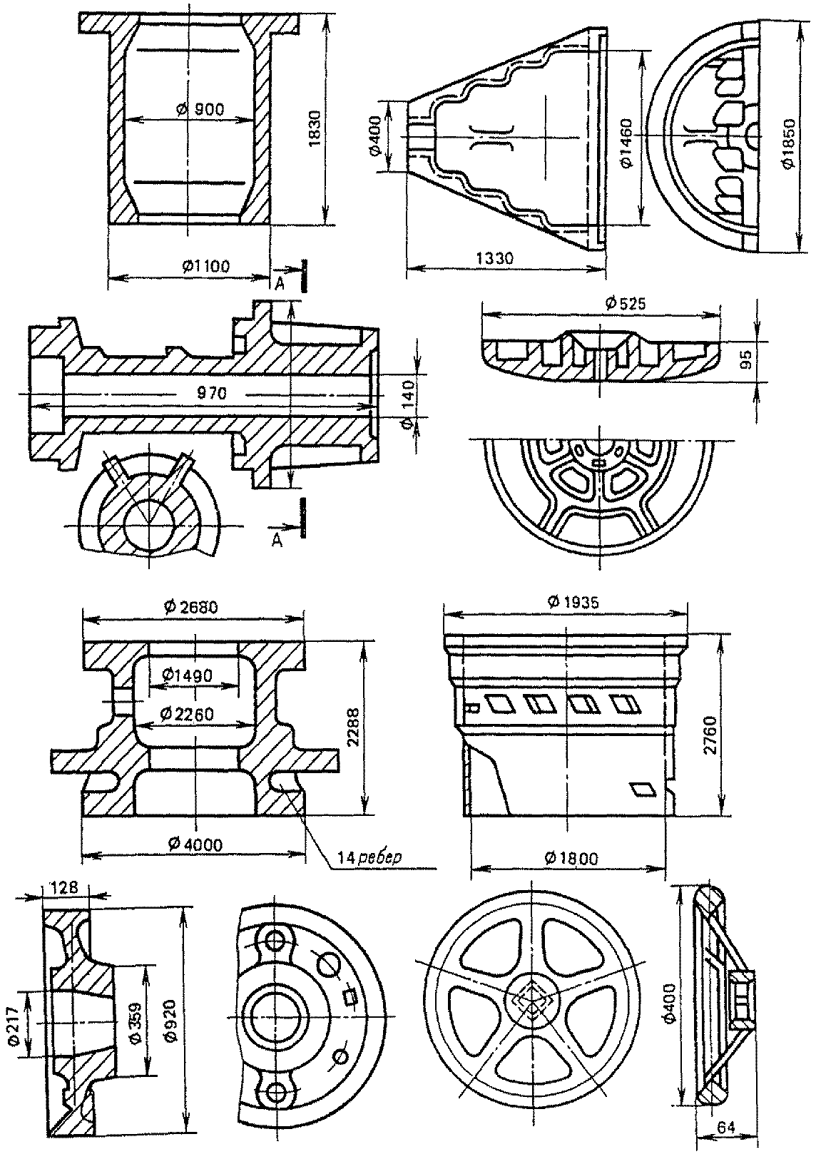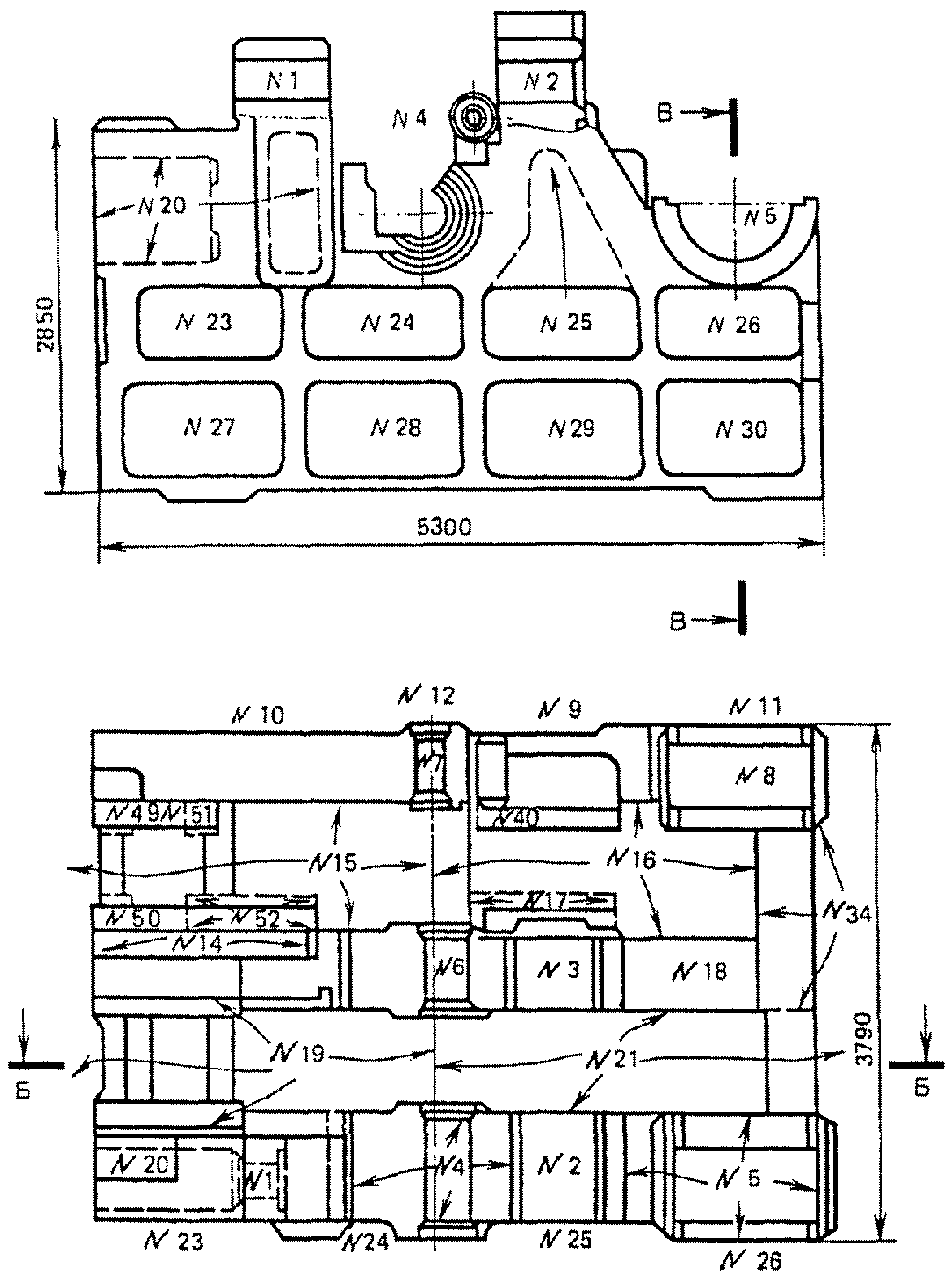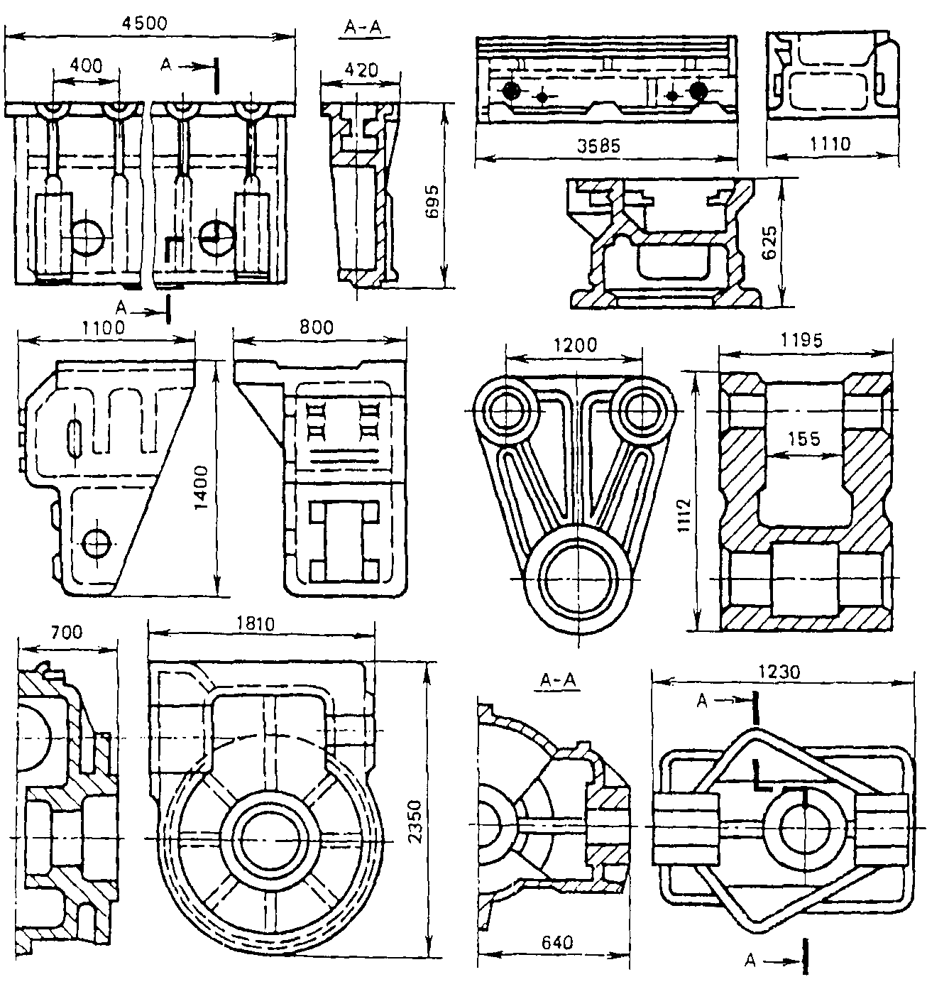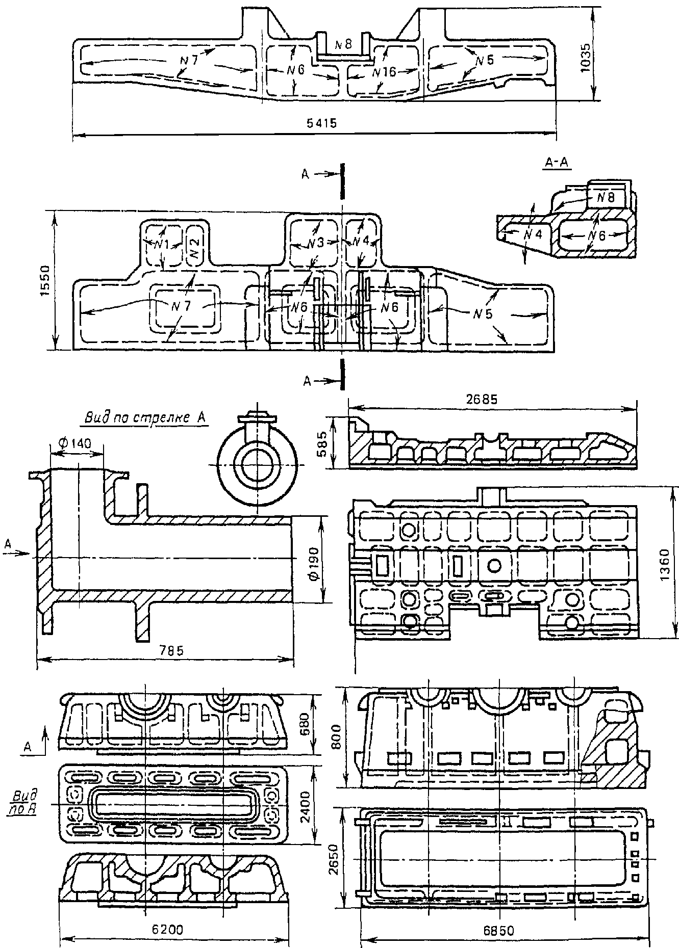 Отливки с прямолинейными и криволинейными поверхностями, с наличием выступов и углублений, окон, внутренних перегородок, конструктивных ребер высотой 100 - 200 мм, расстояние между которыми несколько усложняет процесс очистно-обрубных работ, с преобладающим количеством закрытых стержней простой конфигурации, имеющих по два и более знака. Стержни удаляются через окна, сечение которых меньше сечения тела стержня, что несколько затрудняет извлечение простых проволочных каркасов, рамок, прутков | ||