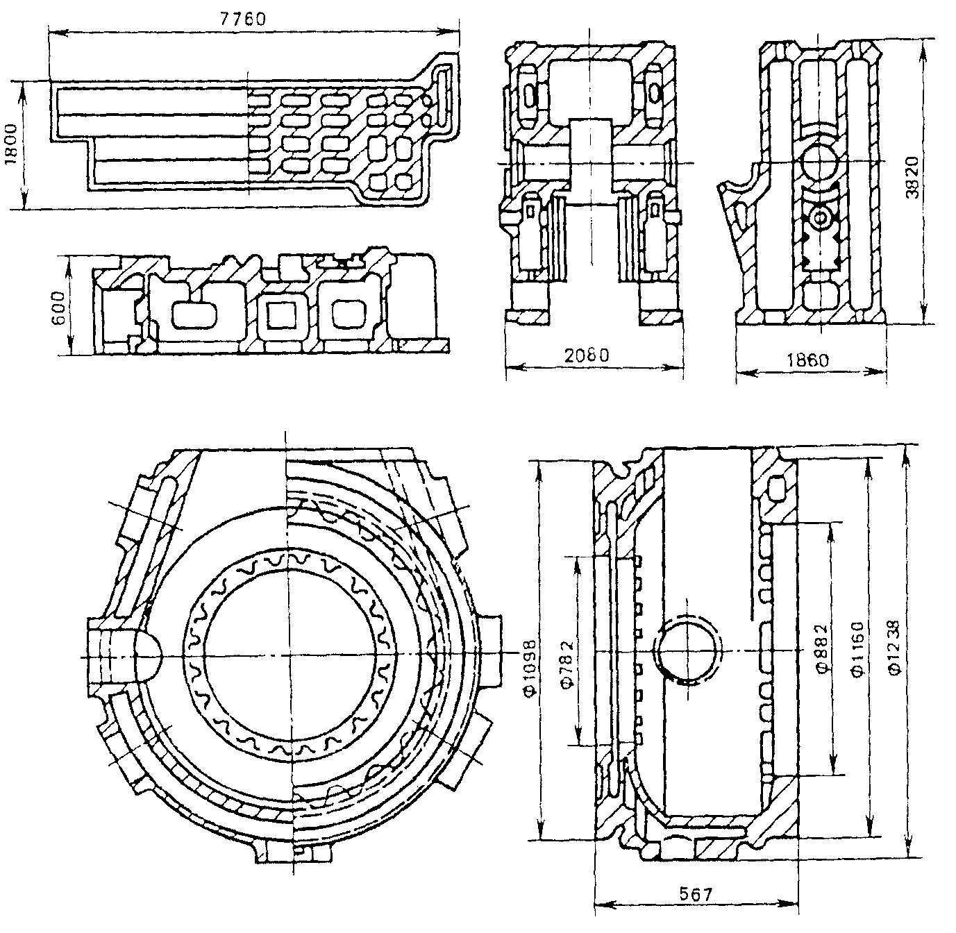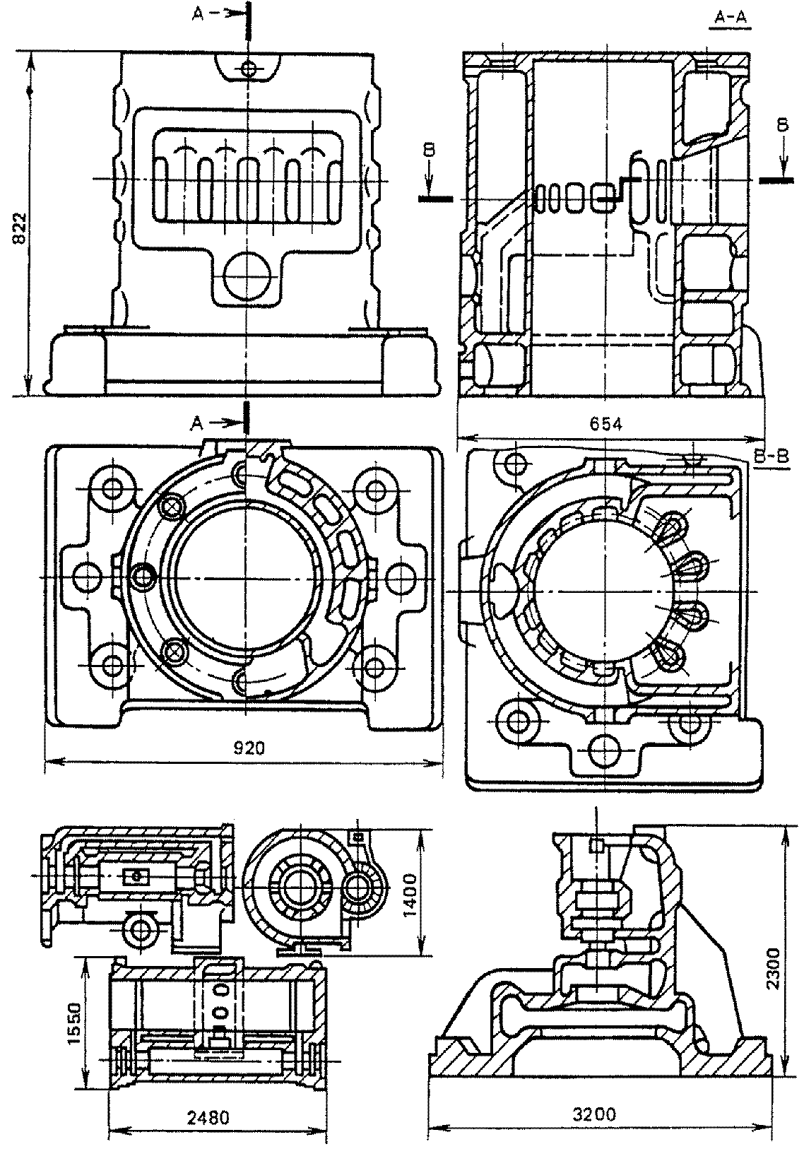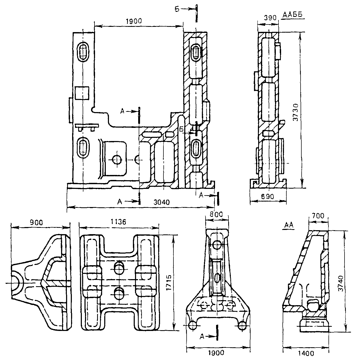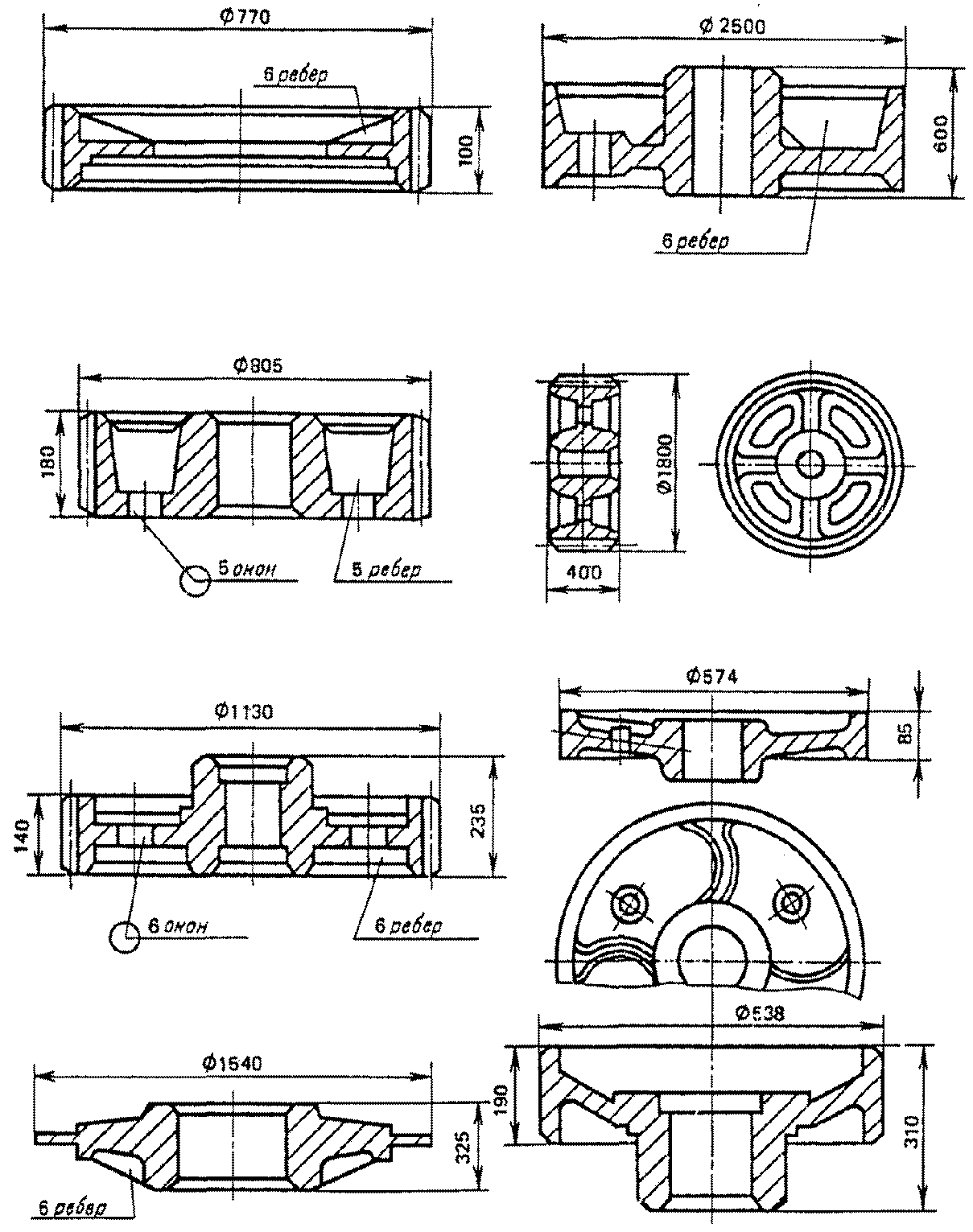 Отливки с прямолинейными и криволинейными поверхностями, с наличием выступов и углублений, окон, внутренних перегородок, конструктивных ребер высотой 100 - 200 мм, расстояние между которыми несколько усложняет процесс очистно-обрубных работ, с преобладающим количеством закрытых стержней простой конфигурации, имеющих по два и более знака. Стержни удаляются через окна, сечение которых меньше сечения тела стержня, что несколько затрудняет извлечение простых проволочных каркасов, рамок, прутков | ||