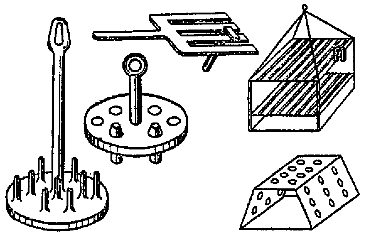 Взять приспособление, поднести и поставить на место навески или навесить на крюк электротельфера. Взять деталь, навесить на приспособление или положить в карман приспособления. Снять деталь с приспособления или вынуть из кармана приспособления, положить в тару. Отстропить от крюка электротельфера приспособление или снять со стола, отнести на место. | |||||||||||||||||
