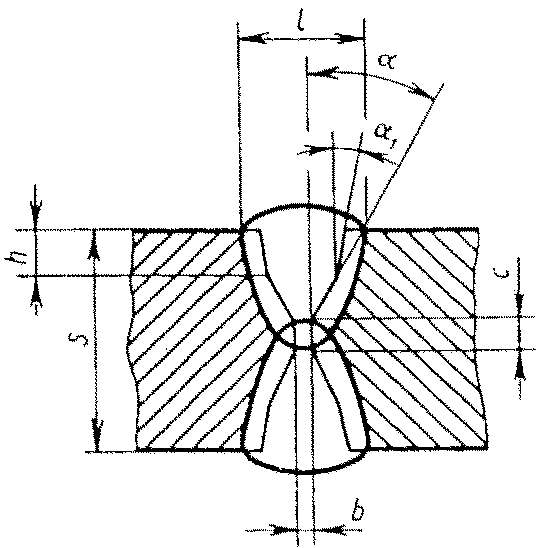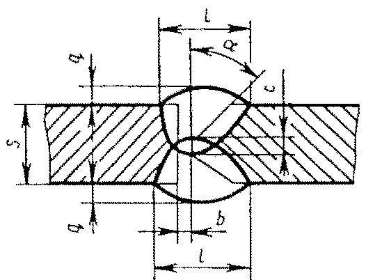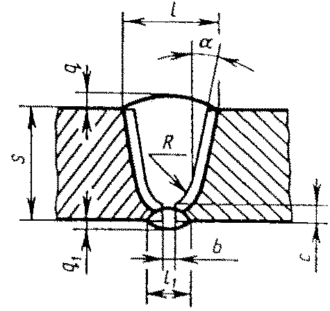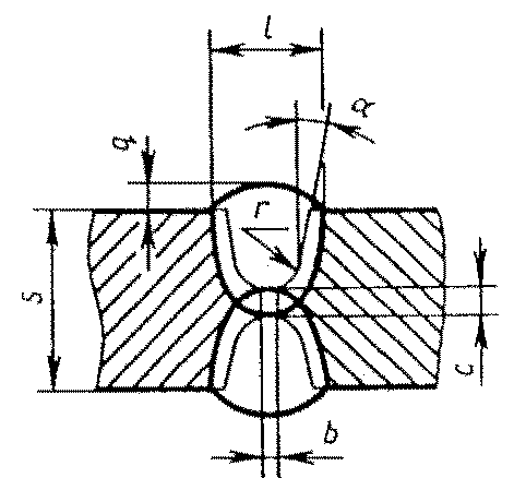 С23 | Стыковых соединений с криволинейным скосом двух кромок двусторонние | ![]() | - основной шовF2 = 0,75 l1 q1 - подварочный шов | |