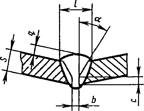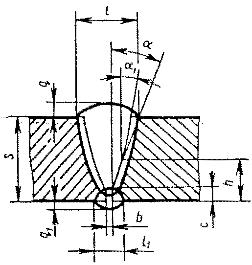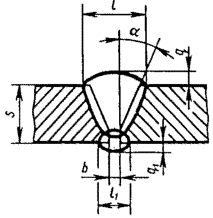 С12 | Стыковых соединений со скосом одной кромки двусторонние | ![]() | - основной шовF = 0,75 l1 q1 - подварочный шов | |