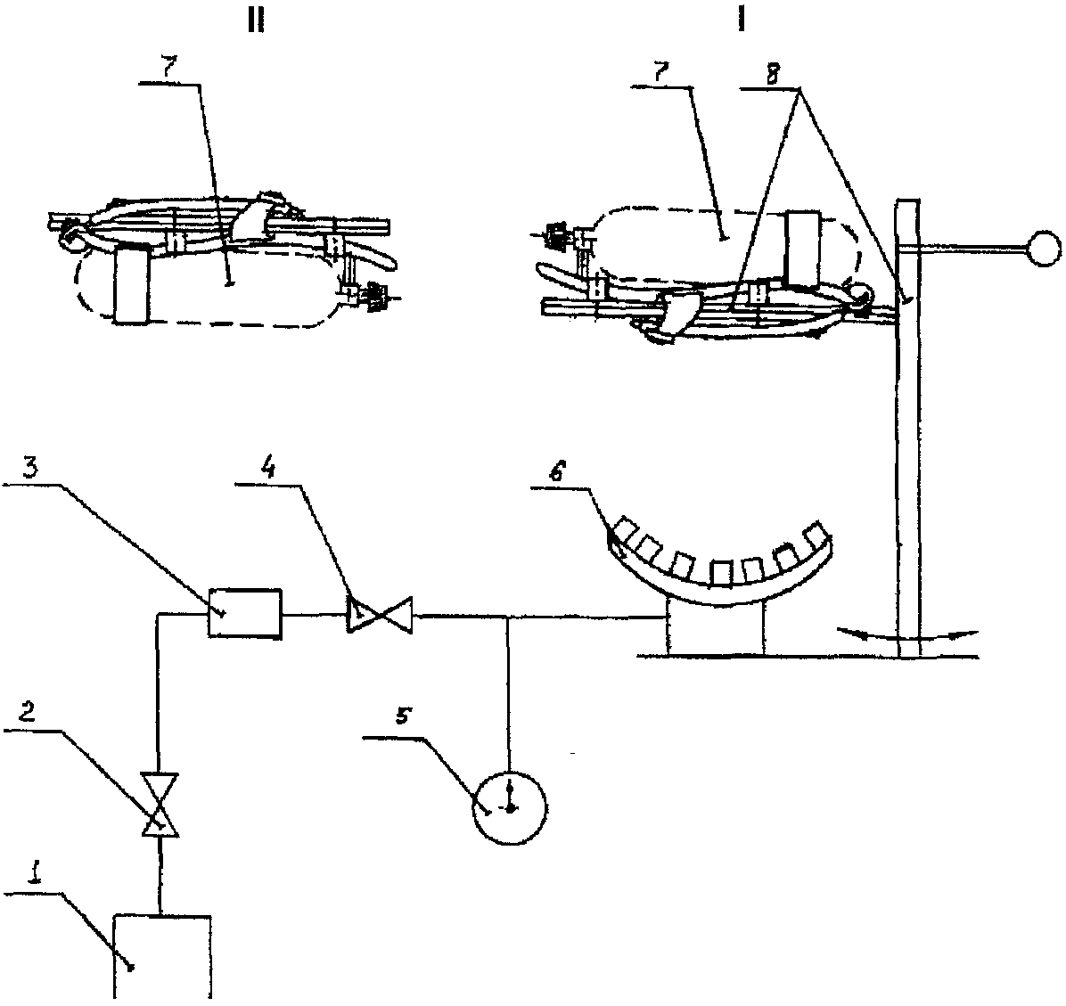 При включении стенда на холостой ход трехходовые краны устанавливают в положение, при котором имитатор дыхания соединяется по воздуховодной системе стенда с окружающей средой. В этом положении испытываемый дыхательный аппарат отключен от имитатора дыхания.