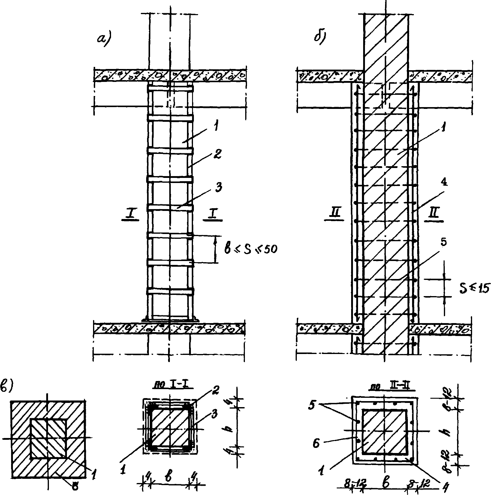 Усиление металлическими обоймами рассчитывается как самостоятельная конструкция, при этом гибкость ее определяется с учетом расположения крепления к усиливаемой железобетонной конструкции.