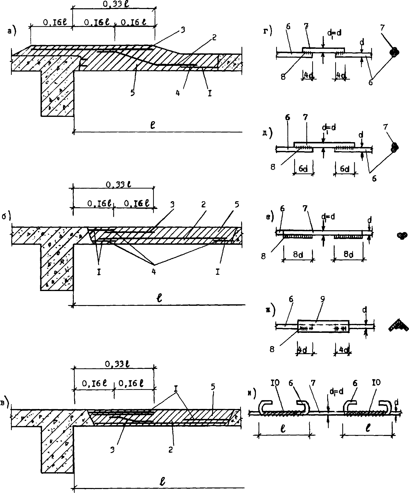 Дополнительная арматура приваривается к стержням основной арматуры при помощи коротышей вразбежку, при этом приварка к существующей арматуре, не заведенной за опору, не допускается.
