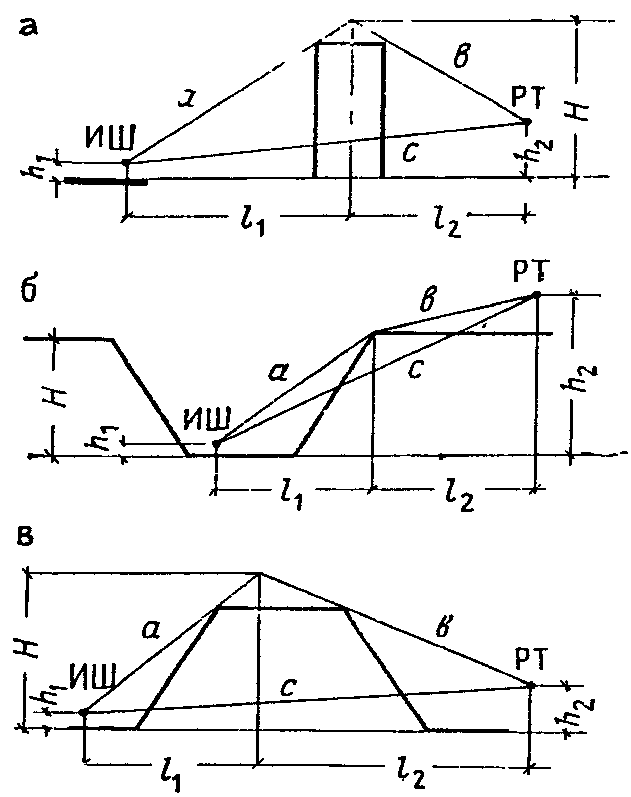 Для больших треугольников видимости, расположенных со значительным наклоном к оси движения экипажей, учет вышеупомянутых требований приведения бывает связан со смещением проекции точки вершины за пределы оси первой полосы движения экипажей, например, проекции точки A или E при приведении треугольников ABC к AB'C' и ЕДГ к ЕД'Г' (рис. 48).