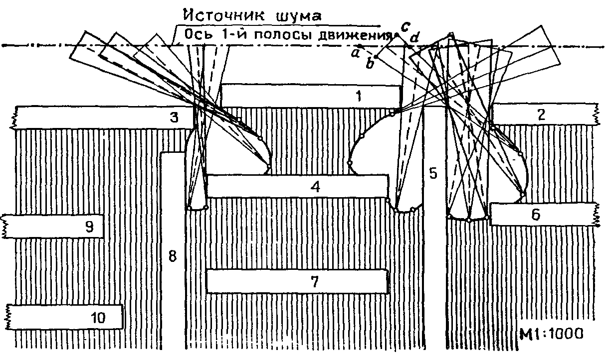 Линии ДКАК строятся наложением треугольников палетки в разрывы между зданиями, как это показано на рис. 47, и фиксированием на плане точки вершины треугольника. При этом следует обращать внимание на то, чтобы у наклонных к оси движения равнобедренных треугольников видимости отрезки, укорачивающие и удлиняющие стороны косоугольного треугольника, оставались одинаковыми. Например, у треугольника в разрыве между зданиями 2 и 5 отрезки ab и cd (рис. 47). Выполнение этого условия будет способствовать правильной замене косоугольных треугольников на эквивалентные равнобедренные, так как при этом сумма длин звуковых лучей будет оставаться постоянной.