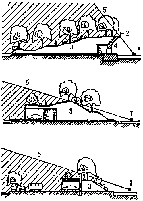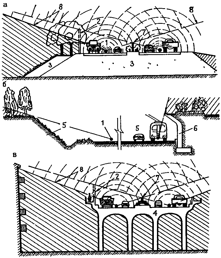 использование шумозащитных свойств рельефа при трассировке автодорог и городских магистралей, прокладку по возможности в тоннелях, выемках, за склонами искусственного или естественного рельефа (холмов, оврагов, балок, земляных кавальеров и пр.)