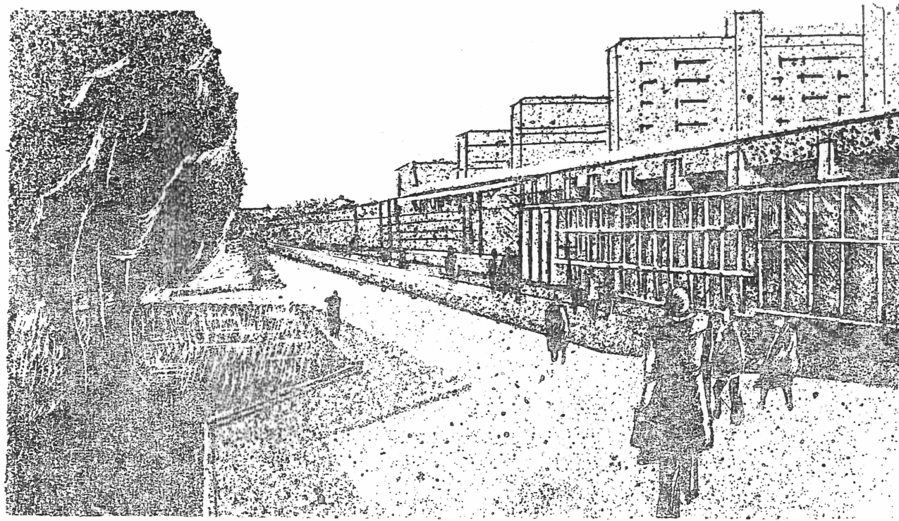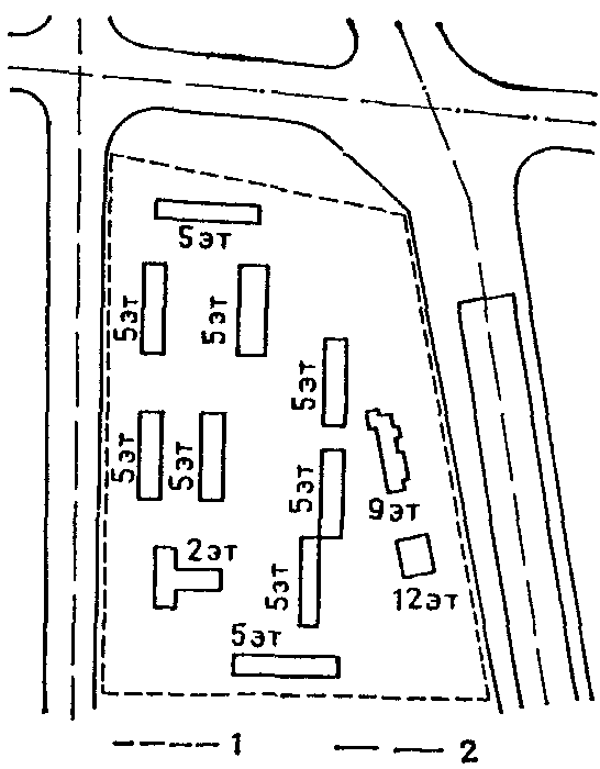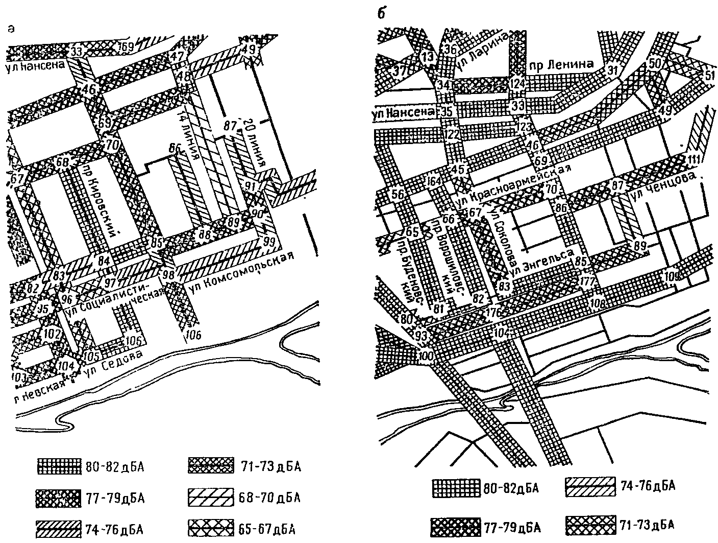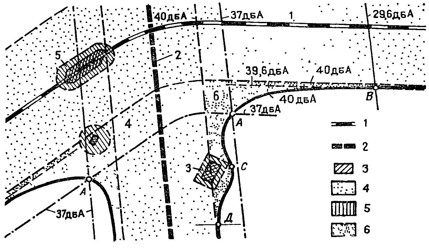 Для определения зон зашумленности межмагистральных территорий на стадии ПДП и ПЗ жилых районов, микрорайонов и отдельных зданий проектно-вычислительным центром Управления Моспроект-1 ГлавАПУ Москвы разработан, эксплуатируется и распространяется комплекс программ NOISE. Для эксплуатации комплекса программ необходимы ЭВМ серии ЕС и автоматизированное рабочее место АРМ-Р/СМЗ. Используя комплекс программ NOISE, можно установить в графическом виде на плановой подоснове зоны и границы зон акустического дискомфорта при заданных нормативных уровнях звука (рис. 50).
