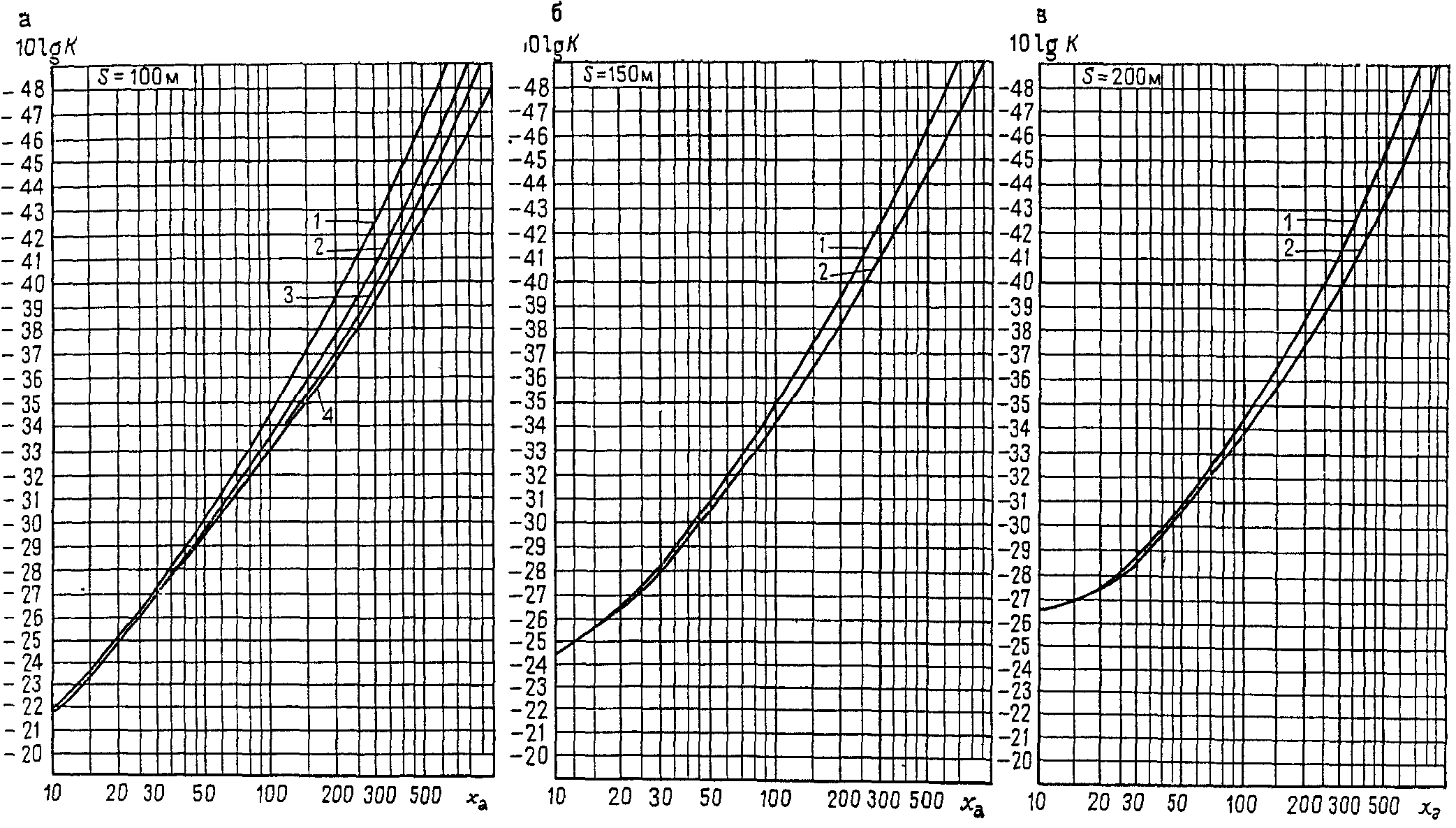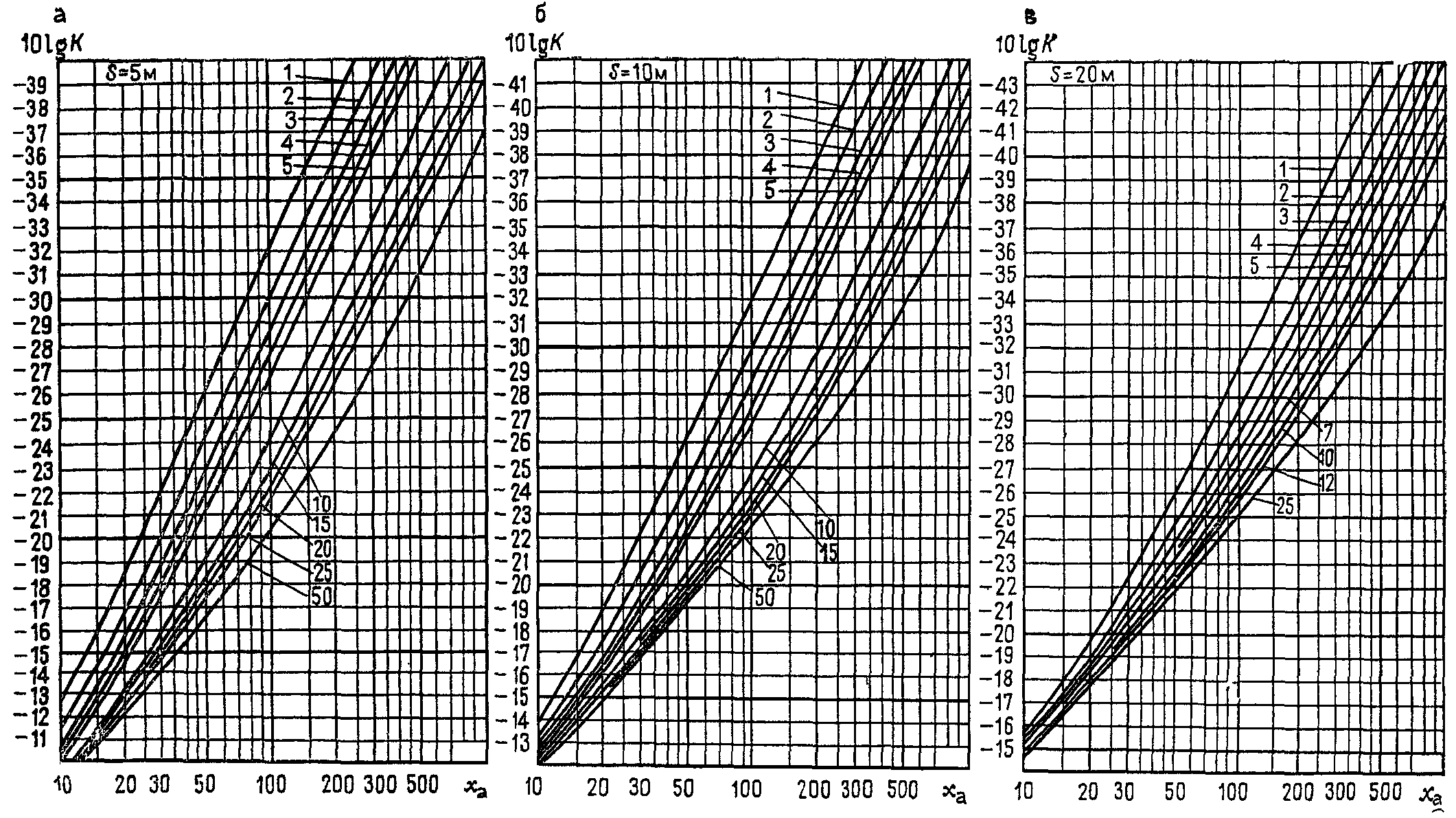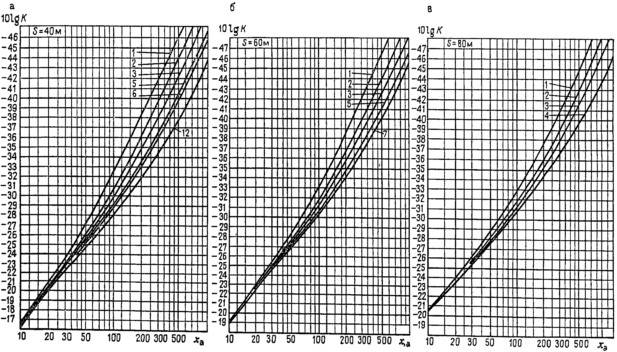 рис. 43 (S = 40 м) определяется глубина проникания шума