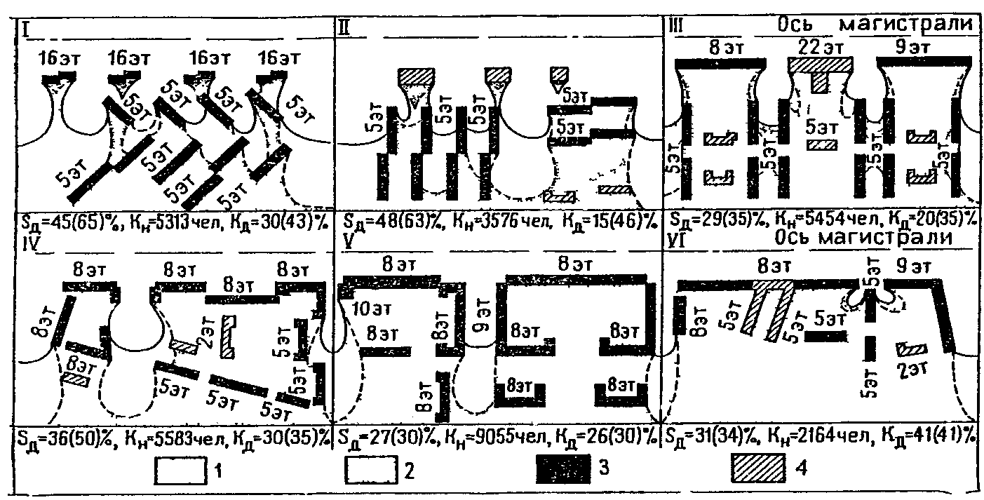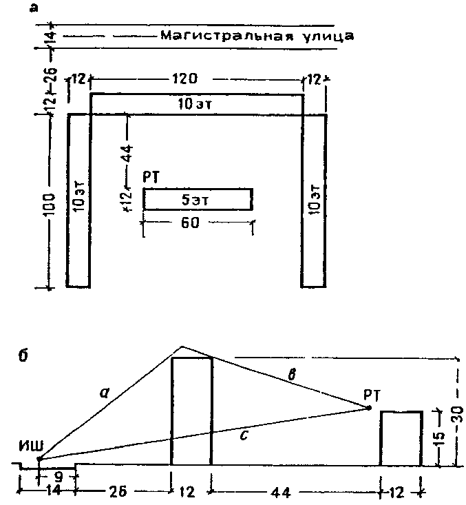 рис. 27 приведены результаты оценки условий зашумленности характерных приемов планировки и застройки примагистральных территорий.