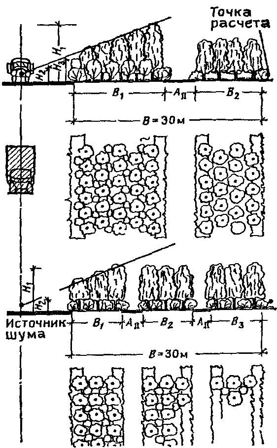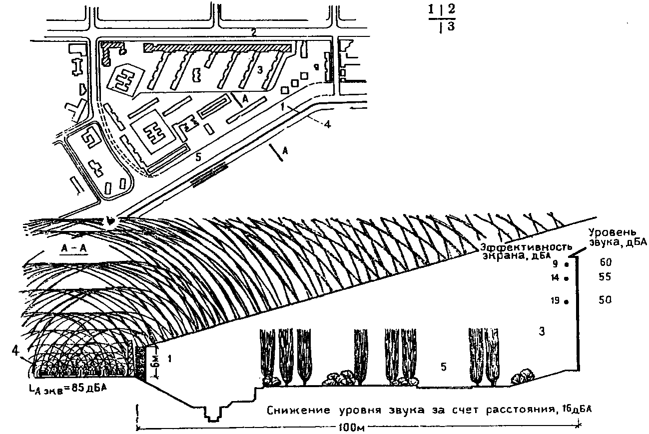 препятствия, экраны, стенки, специальные зеленые насаждения, откосы и т.д., расположенные на пути распространения звука (если их длина и высота более 6 - 10 м), могут снизить уровень звука на 5 - 25 дБА;