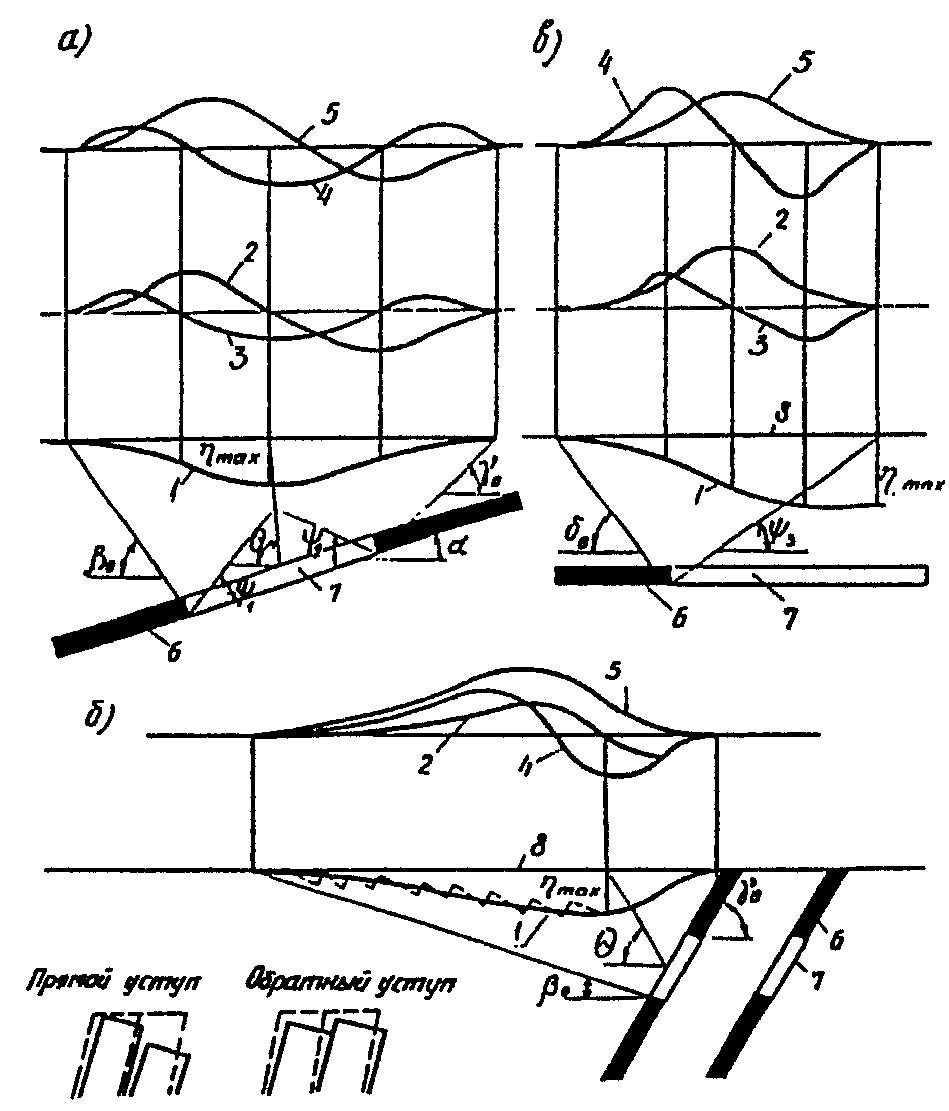 5 - эпюры горизонтальных сдвижений; 6 - пласт;