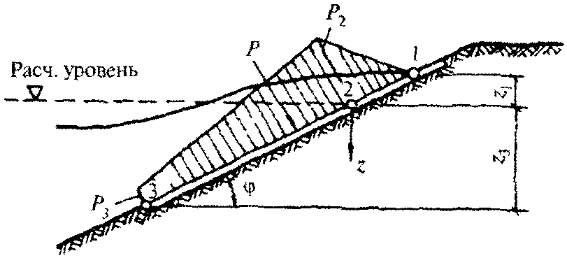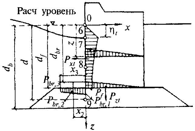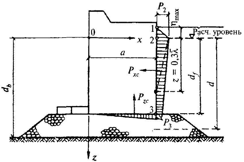 рис. 1) необходимо принимать по эпюре волнового давления, при этом величина p, кПа, на глубине z, м, должна определяться по формуле