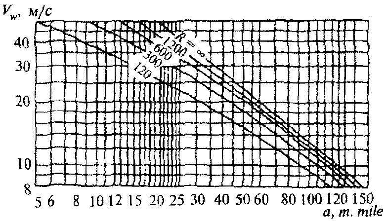 , используя расстояние между изобарами a, m. mile, и радиус кривизны изобар R, m. mile. Направление ветра необходимо отклонять на угол 15 град. от изобары в сторону низкого давления.