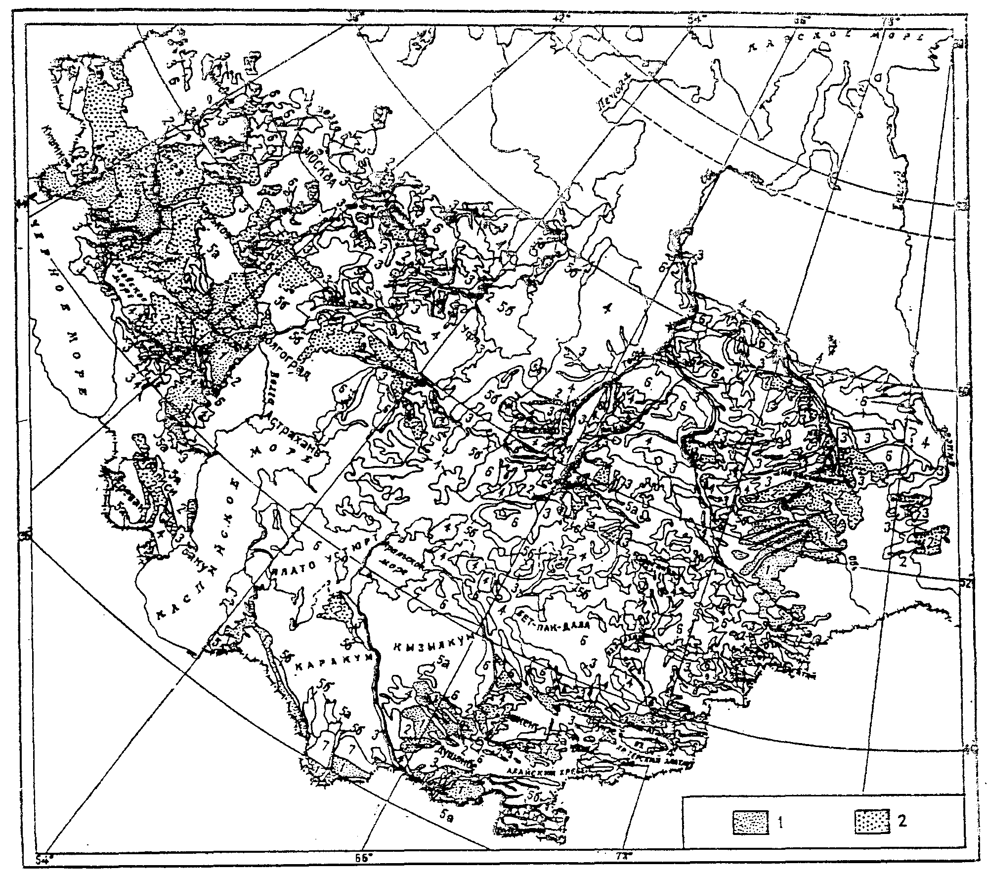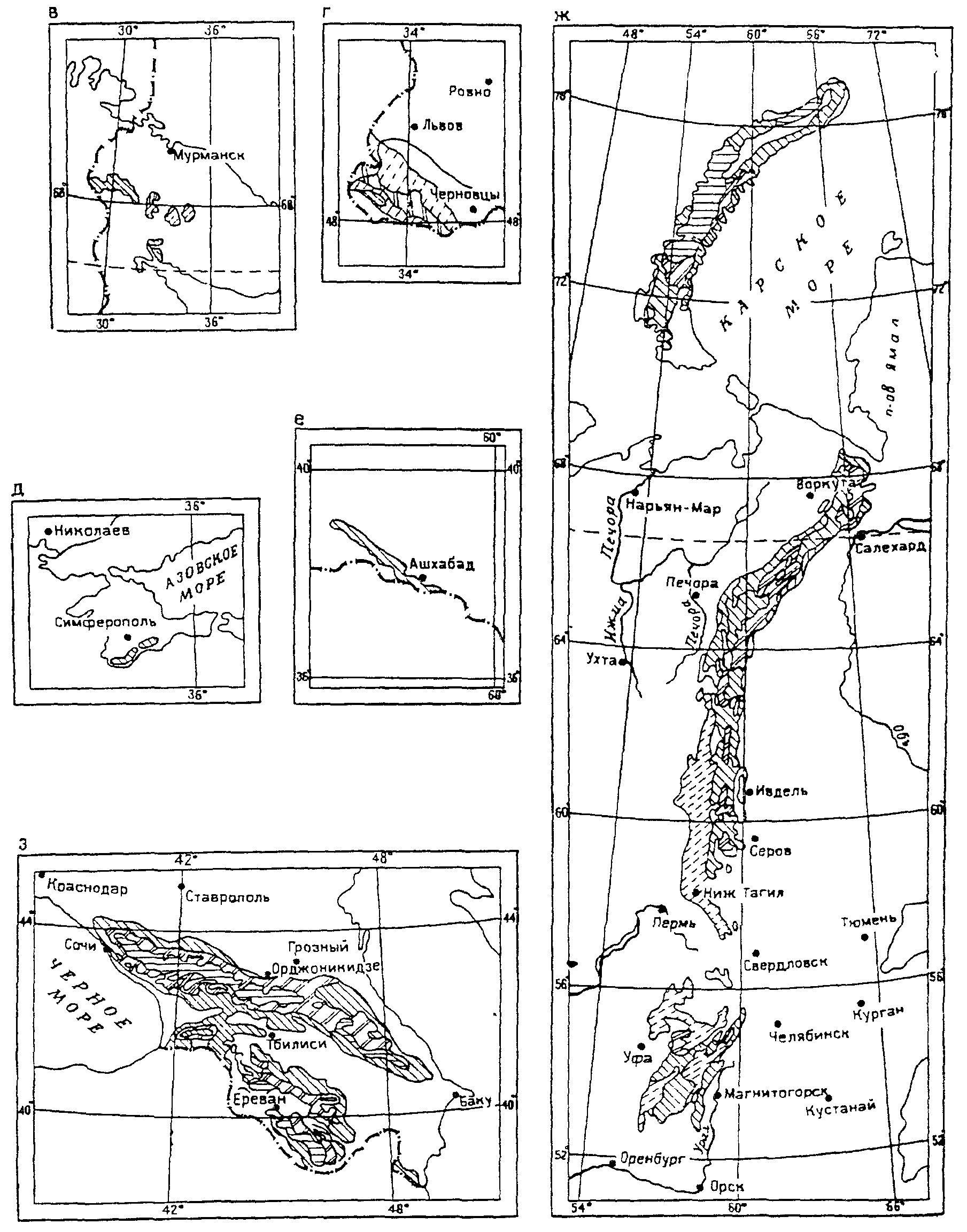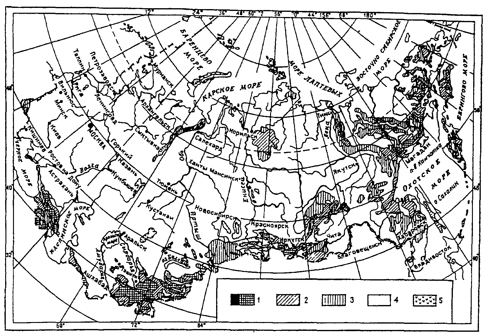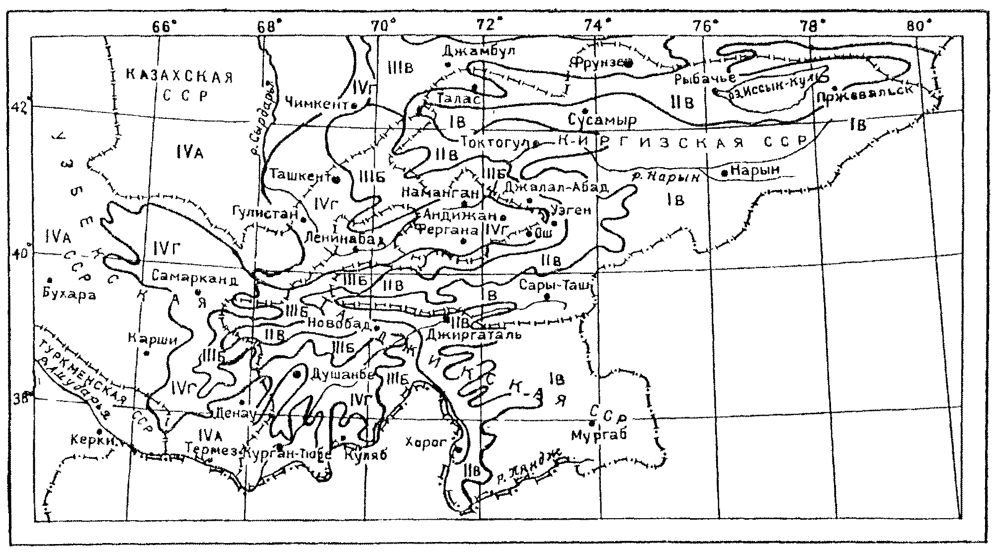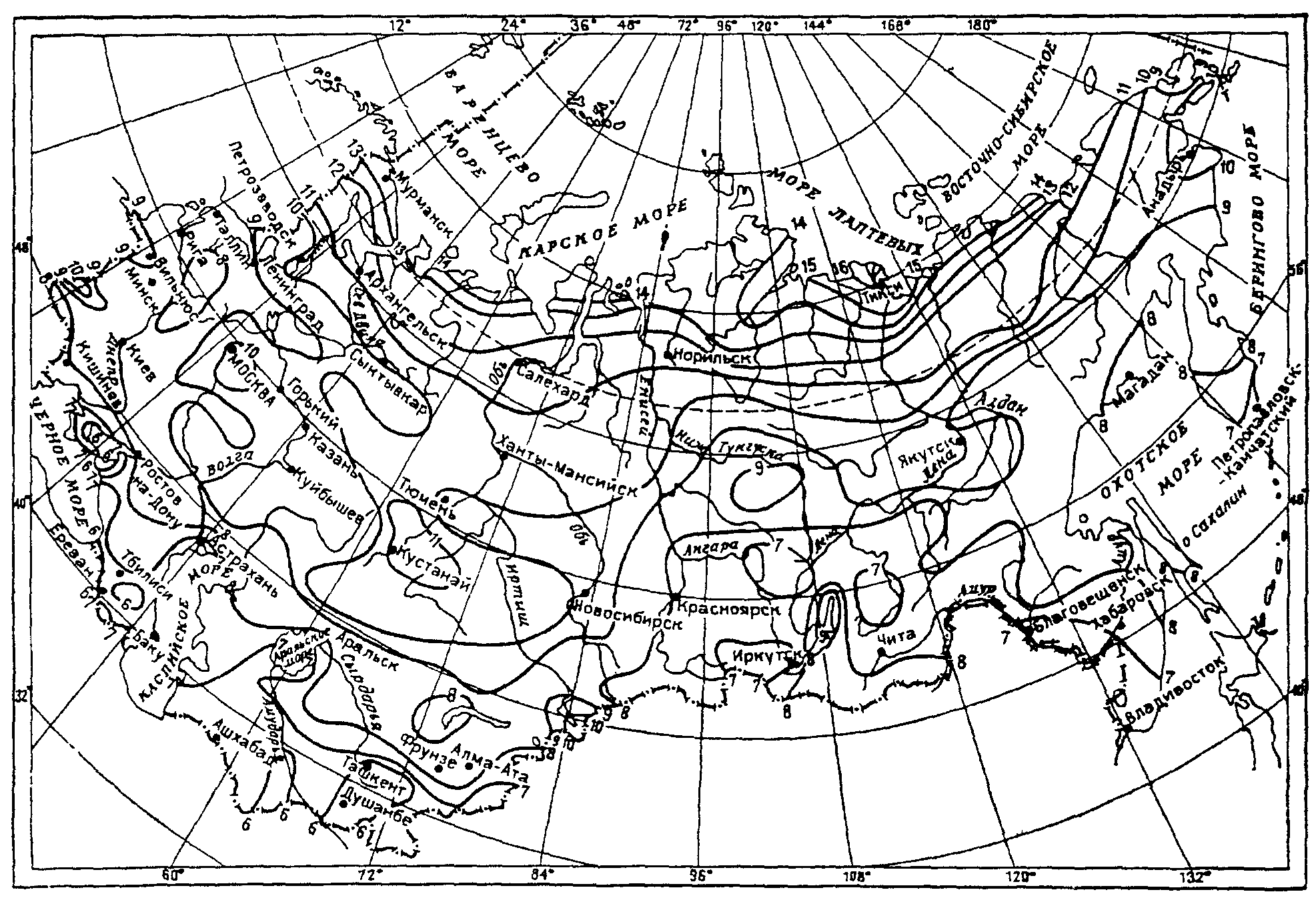 Климатическое районирование разработано на основе комплексного сочетания среднемесячной температуры воздуха в январе и июле, средней скорости ветра за три зимних месяца, среднемесячной относительной влажности воздуха в июле (см. таблицу Прил. 8 и