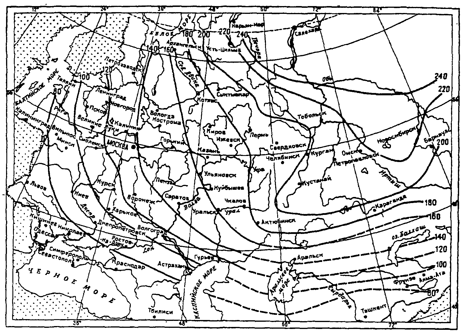 б) С графиков снимаются даты устойчивого перехода средних суточных температур воздуха через 0,8 и 10 °С и по разнице между этими датами определяется продолжительность периодов в сутках, в течение которого средняя суточная температура воздуха устойчиво остается ниже заданных значений.