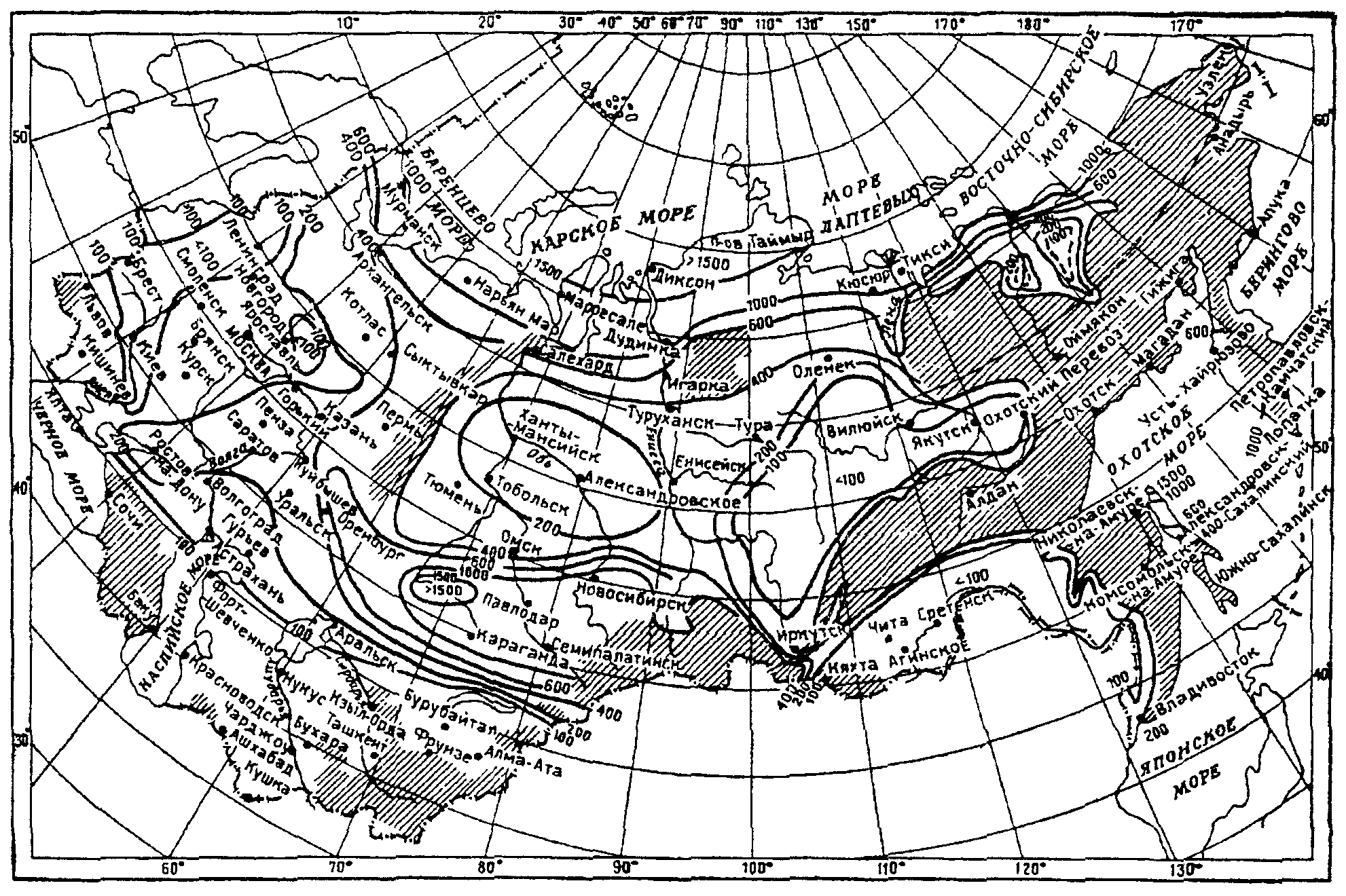 Примечания. 1. Выборка производится из ежемесячных таблиц метеорологических наблюдений (ТМ-1) и метеорологических ежемесячников.