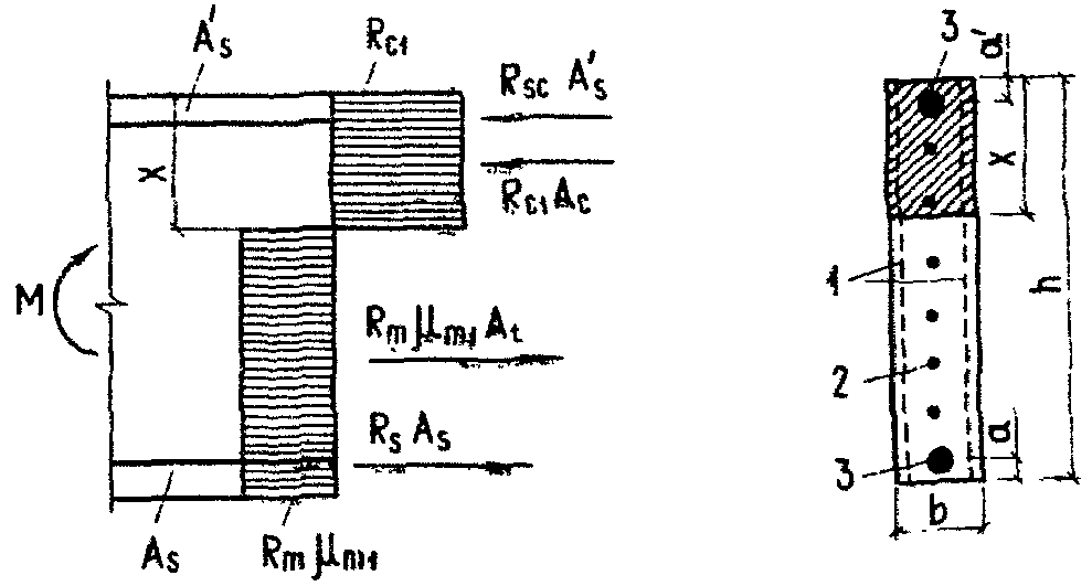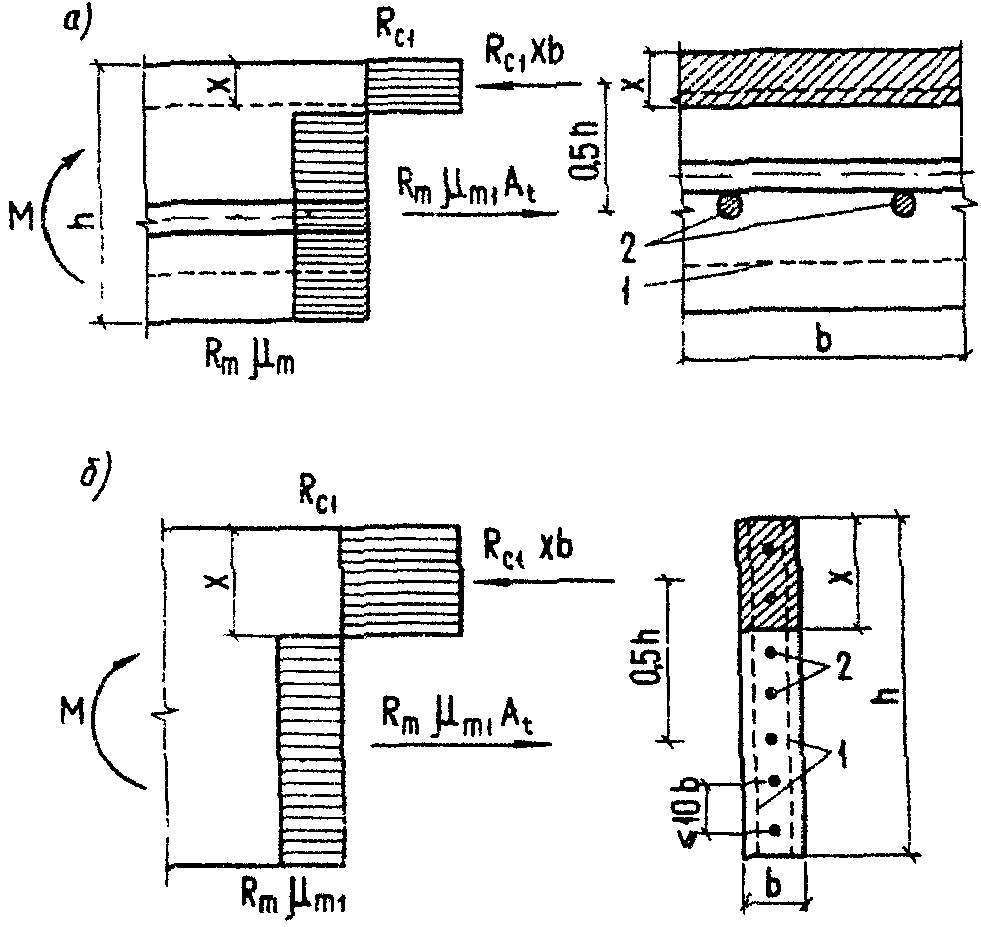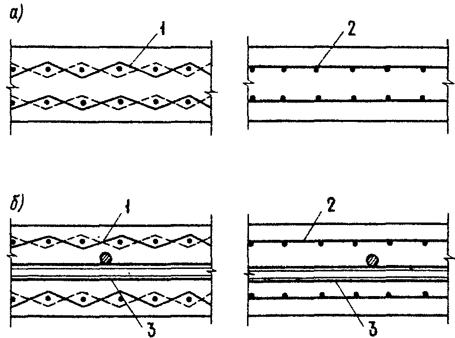 с комбинированным армированием - при их армировании указанными сетками, равномерно распределенными по сечению элемента, в сочетании со стержневой или проволочной арматурой (черт. 1, б).