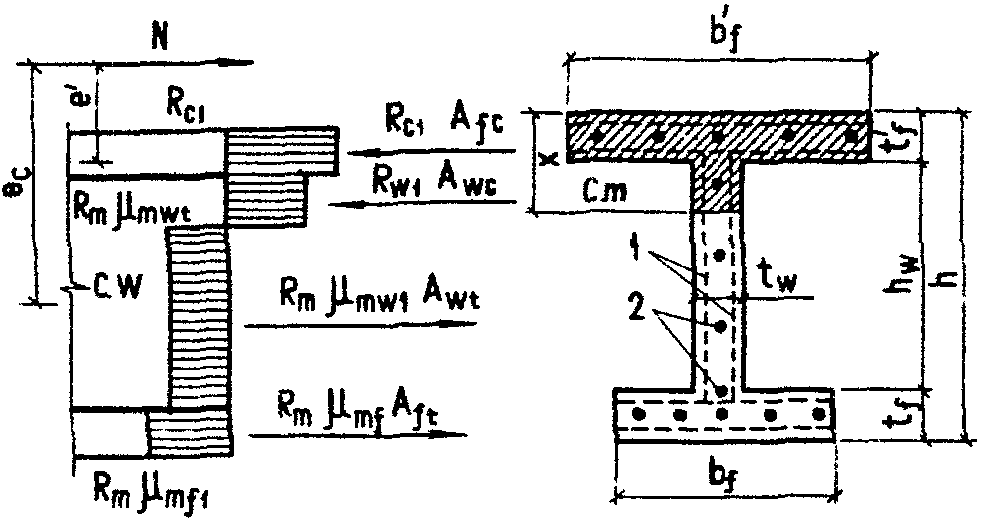 - коэффициенты армирования, приведенные к сетчатому, соответственно для растянутой и сжатой зоны;